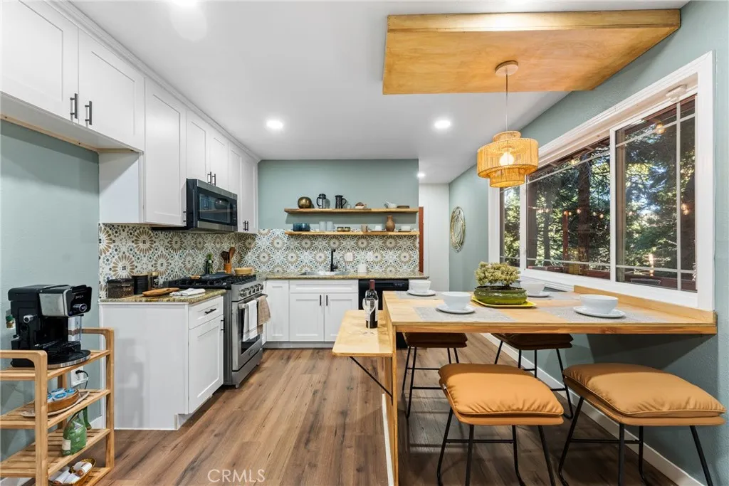 Located minutes from Lake Gregory, this remodeled Crestline home features a thoughtfully designed two bedroom, two bath layout with numerous recent upgrades. The interior offers new flooring, recessed lighting, updated fixtures, and fresh interior and exterior paint. The kitchen and bathrooms have been fully renovated with modern finishes. The open concept main level seamlessly connects the living, dining, and kitchen areas, extending to a deck that provides additional outdoor space for dining or relaxing. The property sits above street level and is accessed by a staircase from the parking area, offering an elevated feel and added privacy. The lot measures approximately 0.12 acres. call Alex 5628328782