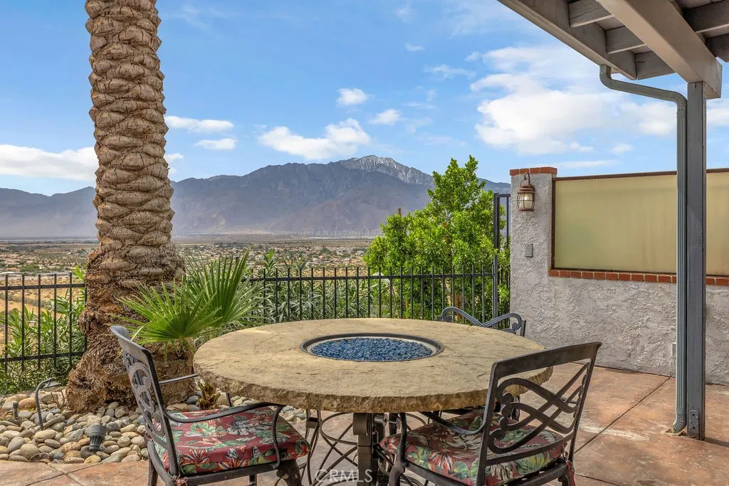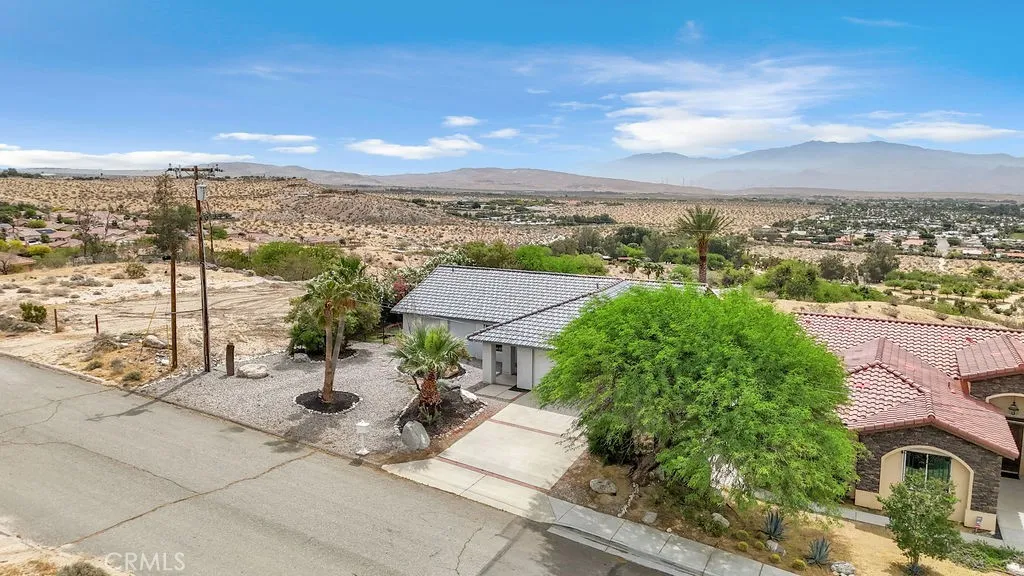 Perched atop Miracle Hill, this beautifully remodeled hilltop home offers breathtaking, unobstructed views of the San Jacinto and San Gorgonio mountain ranges. Designed for both comfort and entertaining, the backyard features a sparkling pool with spa and waterfall, extensive flatwork, stamped concrete, and a full-length covered patioperfect for enjoying the surrounding scenery and desert sunsets. Inside, the home showcases high-gloss marble-style tile flooring, a spacious living room with vaulted ceilings, and an abundance of natural light. Sliding glass doors from the living room, dining area, and primary bedroom create a seamless indoor-outdoor flow, opening directly to the pool and panoramic views. The kitchen is thoughtfully updated with antique-style cabinetry, custom stone countertops, a designer stone backsplash, and matching Samsung stainless steel appliances, including microwave, oven, refrigerator, and dishwasher. A large pantry and direct access to the garage add convenience. All bedrooms are well-appointed, with ceiling fans and updated lighting throughout the home. The secondary bedrooms feature mirrored closet doors, with one offering private patio access. The guest bathroom includes upgraded cabinetry, granite countertops, and a full tub with custom tile surround. The primary suite enjoys stunning mountain views, a spacious walk-in closet, and an en-suite bathroom with updated finishes. This exceptional property combines elevated positioning, quality upgrades, and resort-style outdoor living in a prime Desert Hot Springs location.