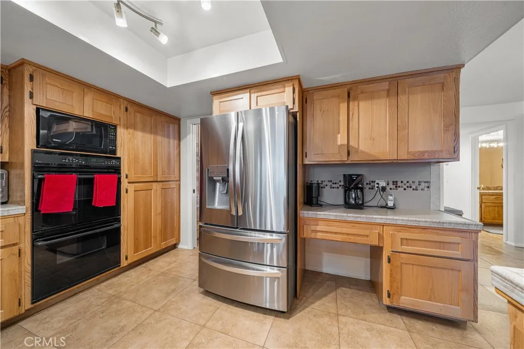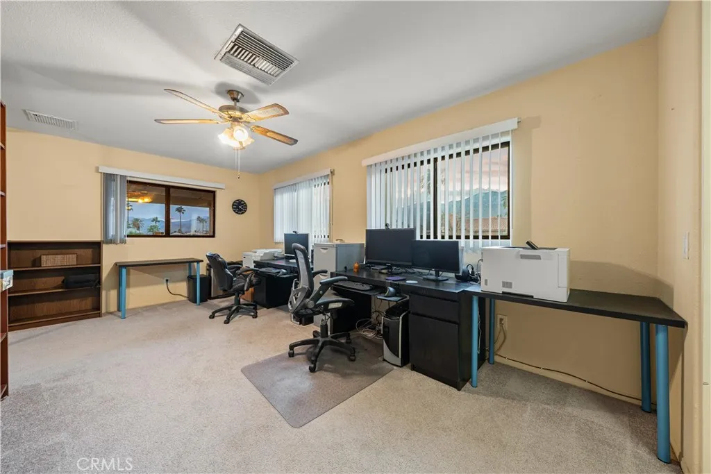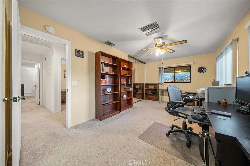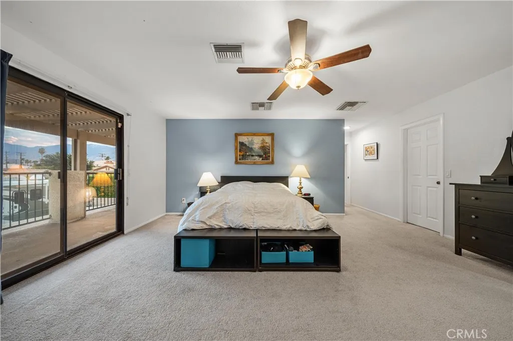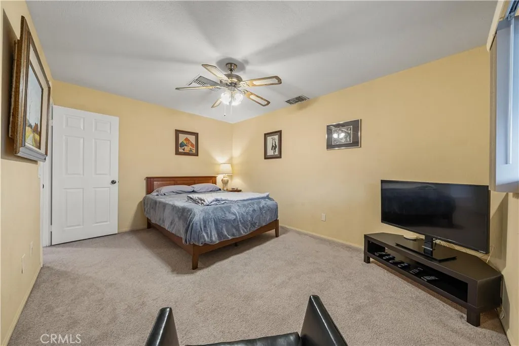 Welcome to this spacious two-story home offering approximately 2,641 square feet of comfortable living space, complete with a three-car garage and RV parking with dedicated power and concrete pad. This three-bedroom, two and one-half bath residence also includes a versatile bonus hobby room or office, ideal for work or creative projects. The open layout features a living room with cathedral ceilings, fireplace, along with a separate family room with fireplace and patio access. The kitchen includes solid hardwood cabinetry with pull-outs and reverse osmosis drinking water. The primary suite offers a walk-in closet, ceiling fan, dual sinks, soaking tub, separate shower, and private balcony showcasing beautiful mountain views. Additional comforts include ceiling fans in all bedrooms, ample storage throughout, and a well-appointed laundry room with utility sink and pet door. The backyard is an entertainer's dream with heated pool and spa, Alumawood patio covers on both levels, Kool Deck surfacing, gas BBQ hookup, privacy hedges, lawn, rose garden, and a large storage shed. Energy efficiency shines with 6 KW owned solar panels, evaporative coolers on both levels and recent upgrades including newer HVAC systems, tile roof underlayment, pool pebble-tec finish, updated pool equipment, water heater, and refurbished evaporative coolers. A prime opportunity to enjoy comfort, space, and outdoor living in a well-maintained home.