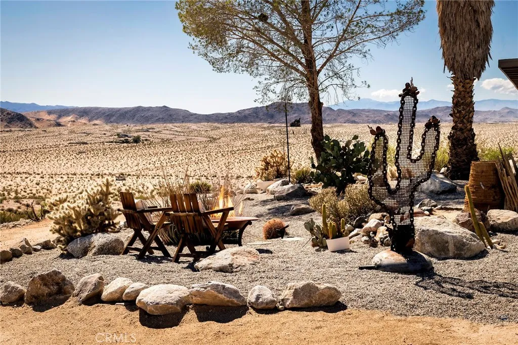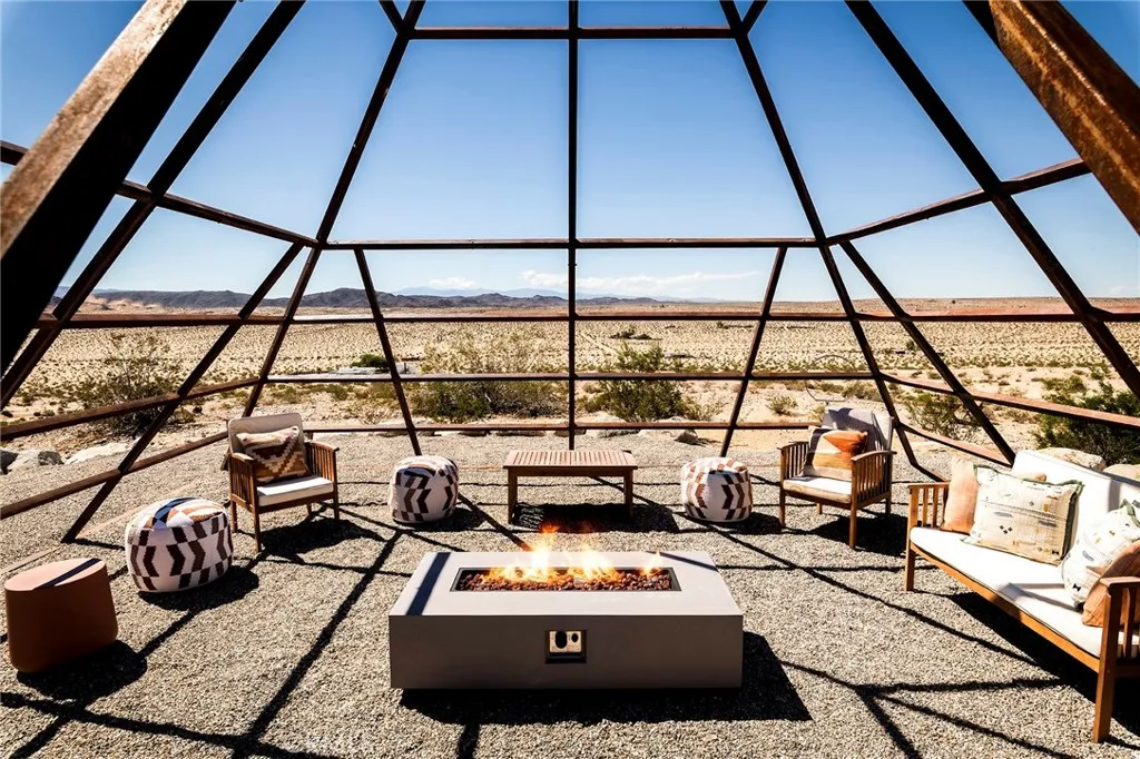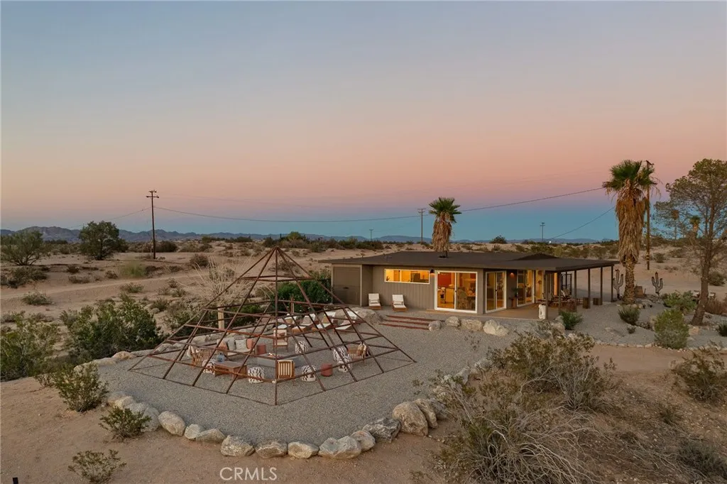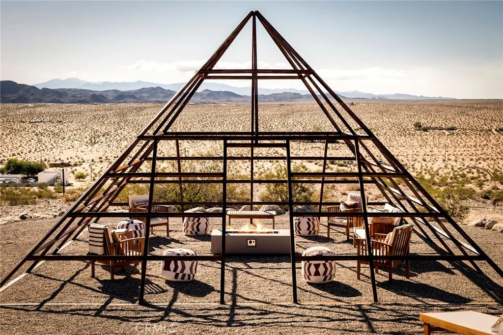 29 WEST PYRAMID HOUSE: Perched on the top of its own mountain, this striking 2-bedroom, 2-bathroom retreat delivers 360-degree views spanning Indian Cove in Joshua Tree National Park, Big Bear, and San Gregorio. Framed by dramatic imported boulders and pristine desert landscape, the property offers a rare blend of privacy, serenity, and natural beauty. At night, the dark skies transform into a stargazers dream, making this a true High Desert sanctuary. The centerpiece of the landscape is a bold steel-frame pyramid, measuring 24' x 24' x 14', positioned at the mountains edge. This dramatic outdoor structure creates a visual anchor and an unforgettable backdrop for both day and night desert living. Inside, the home is curated with Venetian plaster walls, lime wash finishes, and custom vertical plaster striping. The open floor plan is framed by expansive sliding glass doors and an 8-foot picture window, pulling the desert scenery directly into the living space. Spa-inspired bathrooms feature floating vanities, backlit mirrors, wood tile, and marble finishes, blending sophistication with soothing desert textures. A shaded porch extends from the living room, offering a peaceful vantage point for sunrise coffee or evenings under the stars. Custom channel lighting in the living room mirrors the sharp lines of the pyramid, emphasizing the interplay of geometry and desert landscape. The large kitchen showcases brand-new counters, custom cabinetry, and generous storage designed for both everyday use and stylish entertaining. Centrally located at the edge of 29 Palms and Joshua Tree,