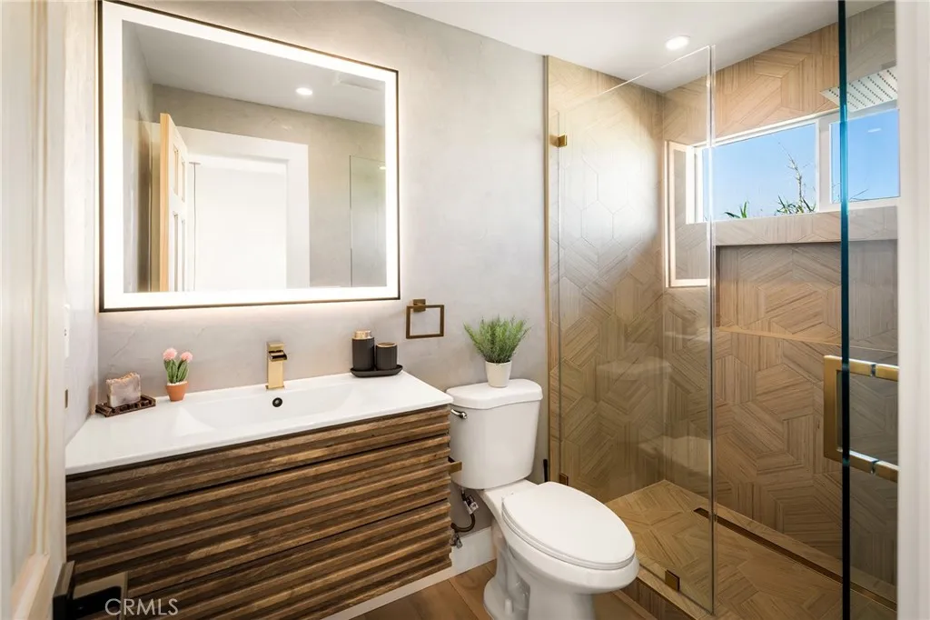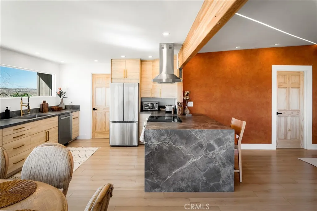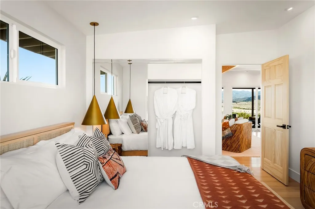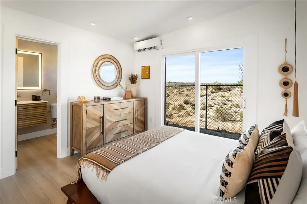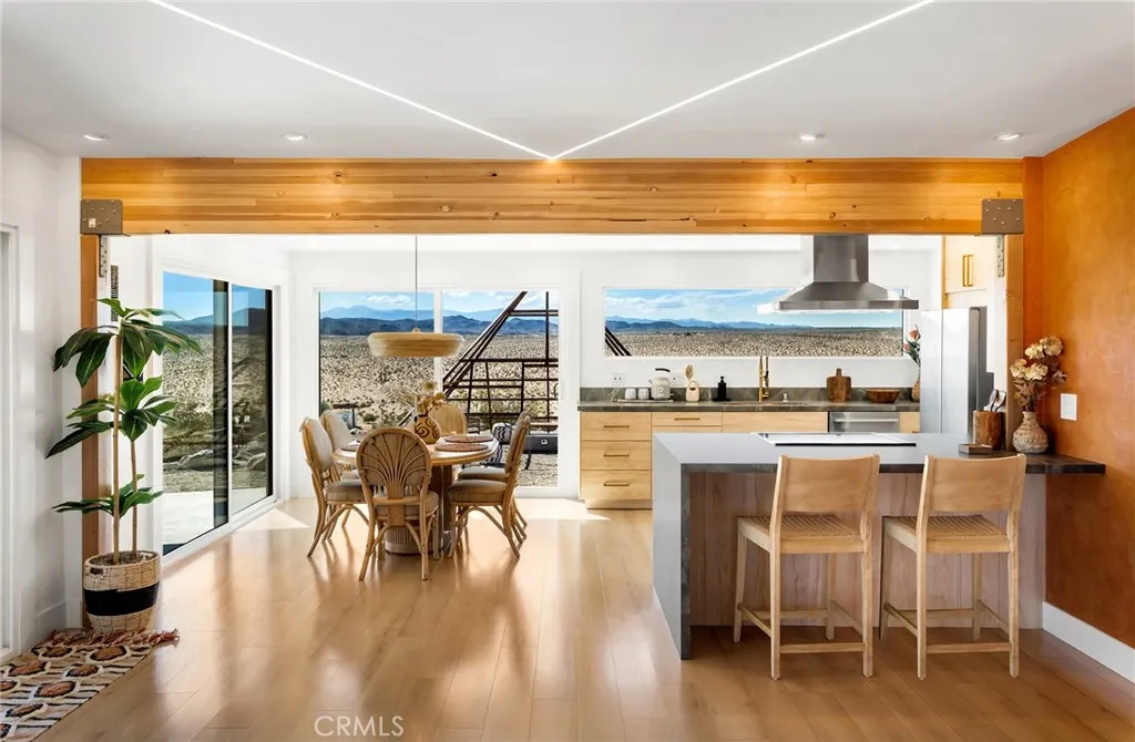 29 WEST PYRAMID HOUSE: Perched on the top of its own mountain, this striking 2-bedroom, 2-bathroom retreat delivers 360-degree views spanning Indian Cove in Joshua Tree National Park, Big Bear, and San Gregorio. Framed by dramatic imported boulders and pristine desert landscape, the property offers a rare blend of privacy, serenity, and natural beauty. At night, the dark skies transform into a stargazers dream, making this a true High Desert sanctuary. The centerpiece of the landscape is a bold steel-frame pyramid, measuring 24' x 24' x 14', positioned at the mountains edge. This dramatic outdoor structure creates a visual anchor and an unforgettable backdrop for both day and night desert living. Inside, the home is curated with Venetian plaster walls, lime wash finishes, and custom vertical plaster striping. The open floor plan is framed by expansive sliding glass doors and an 8-foot picture window, pulling the desert scenery directly into the living space. Spa-inspired bathrooms feature floating vanities, backlit mirrors, wood tile, and marble finishes, blending sophistication with soothing desert textures. A shaded porch extends from the living room, offering a peaceful vantage point for sunrise coffee or evenings under the stars. Custom channel lighting in the living room mirrors the sharp lines of the pyramid, emphasizing the interplay of geometry and desert landscape. The large kitchen showcases brand-new counters, custom cabinetry, and generous storage designed for both everyday use and stylish entertaining. Centrally located at the edge of 29 Palms and Joshua Tree,