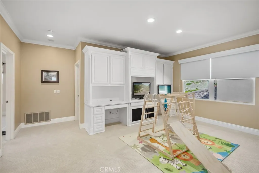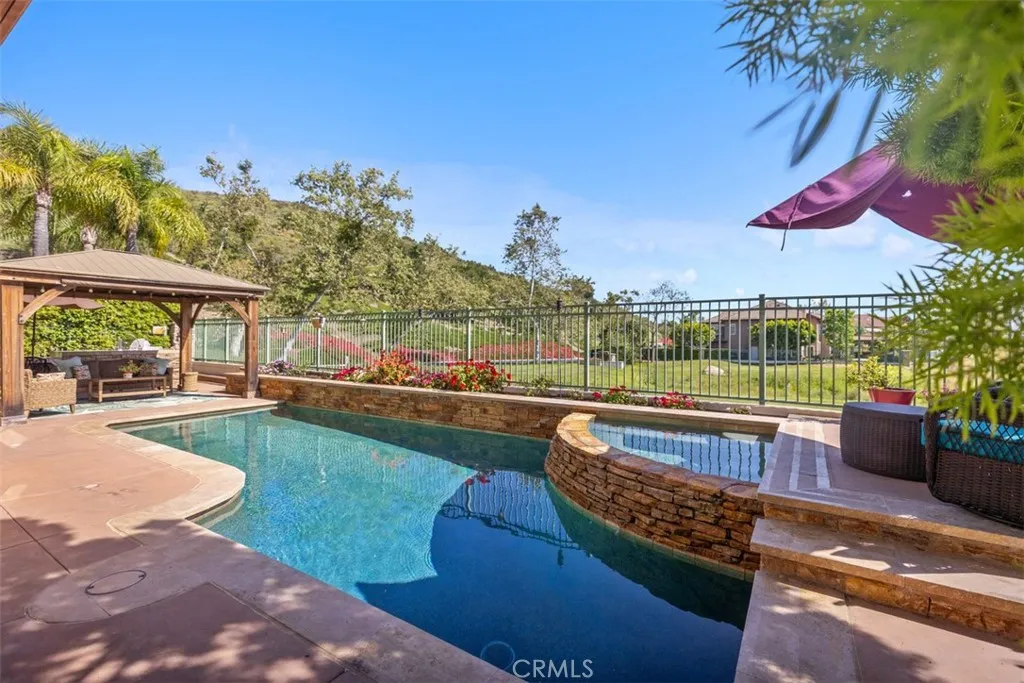 Stunning Pool Home with Golf Course & Mountain Views! This meticulously maintained 4-bedroom plus an office and bonus room, 4.5-bathroom residence offers an exceptional lifestyle. The retreat can be converted into a fifth bedroom for added convenience. Enter to discover a bright and airy formal living and dining area with soaring ceilings and picturesque windows. The gourmet kitchen boasts a walk-in pantry, double ovens, center island with wine fridge, and breakfast bar overlooking the sparkling pool. The adjacent family room features a fireplace and built-in entertainment center. The main-level is complete with a bedroom with ensuite bath, powder room, laundry room, and 3-car garage for added convenience. Upstairs, find a grand primary suite with an office, balcony, and luxurious bathroom with a walk-in shower, soaking tub, dual sinks, and dual-access walk-in closet. Two additional bedrooms, two bathrooms, and a bonus room complete the upper level. The entertainer's backyard is a true oasis with a pool, spa, comfortable seating, built-in BBQ with bar, and kegerator. Enjoy scenic golf course and mountain views from this desirable property. Property has Leased Solar. Located within a prestigious 24-hour guard-gated community, and as a resident of Dove Canyon, youll enjoy access to a Jr. Olympic pool, tennis courts, pickleball court, sport court, playground, and scenic trails with access to hiking, biking and horse trails. You will also have the option to join Dove Canyon Golf Club, a Jack Nicklaus Signature design with dining, wine room, gym and more.