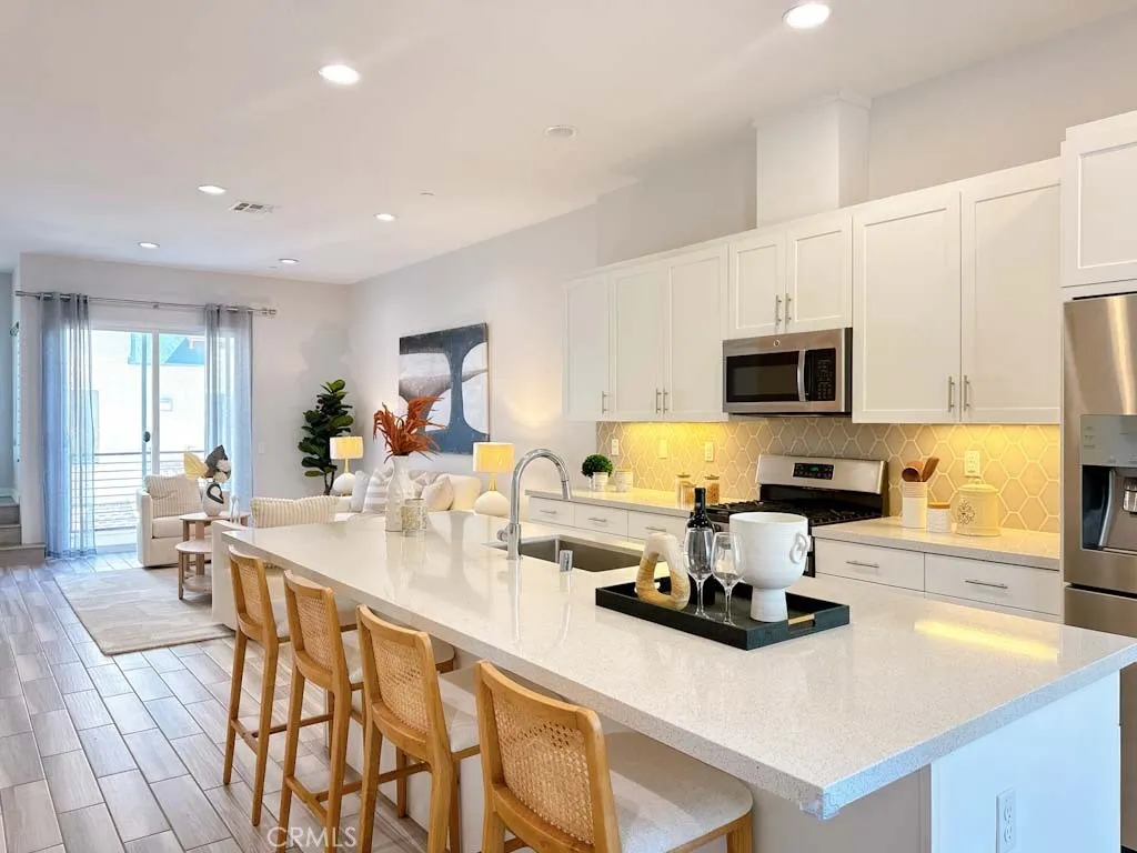This well-designed three-story townhome offers a functional and modern layout with 1,864 square feet of living space, 4 bedrooms, 3.5 bathrooms (1bedroom and 1 bathroom on the first level), 2-car garage. The first floor features a private bedroom and living area, ideal for guests, extended family, or a home office setup. The second floor serves as the main living level and welcomes you with a bright and open floor plan. The spacious living room flows seamlessly into the dining area and kitchen, creating an inviting space for everyday living and entertaining. The upgraded kitchen features quartz countertops, a large center island, ample cabinetry, and stainless-steel appliances. A guest powder room is conveniently located on this level. Two private balconies, one on each side, that bring in natural light and provides an enjoyable outdoor space. The third floor offers three additional bedrooms and two full bathrooms, including the primary suite. The spacious primary bedroom provides comfort and privacy, while the additional bedrooms are well-sized and ideal for family living. Other features include, tiles on first and second floor, vinyl on the third floor, custom two-tone paint, roller shades, recessed lights, water softener, and EV charger in garage. Located in the highly desirable city of Brea, this home offers a prime and convenient location close to shopping, dining, and major freeways. The property is also situated within a highly regarded school district, making it a great opportunity in one of Breas most sought-after communities. This home is an excellent choice for b