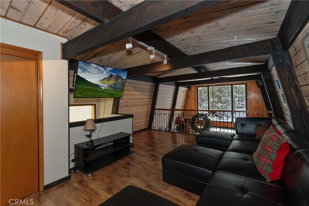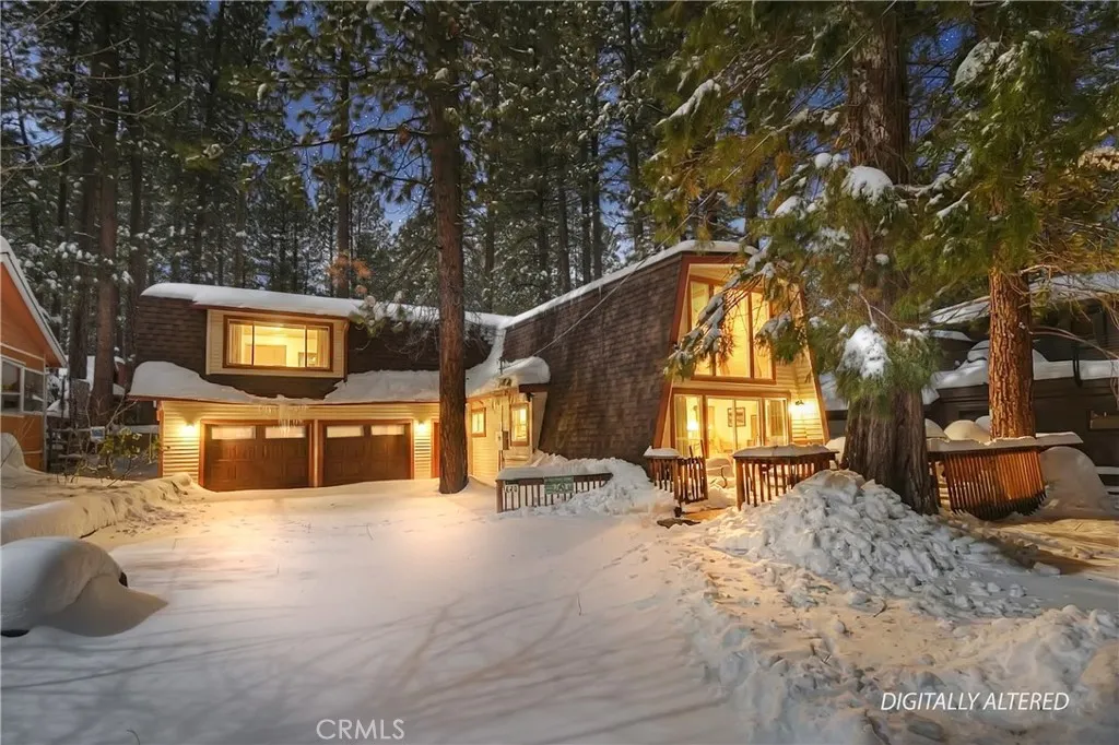 Walk to Snow Summit from this fantastic Modified A-Frame home ~ Inside you are greeted by a soaring tongue and groove ceiling in the living room with a native stone wood burning fireplace ~ Wood grain laminate flooring runs throughout the home except in the bedrooms where you have comfy carpet ~ The main level consists of the living room with a large dining area, the kitchen with granite counter tops and plenty of cabinets, storage areas, and a full bathroom ~ Through the kitchen you cross the indoor laundry area into the attached 2 car garage ~ Currently the garage is being used as a large game room with a built in bar ~ Upstairs you have a large loft with a closet that overlooks the living room and could be used as your 3rd bedroom ~ Through the loft there is a bonus sleeping nook with a bunkbed set up ~ This is where you find the second full bathroom with dual sinks ~ You have both bedrooms upstairs as well with the West facing bedroom having its own balcony deck that gives access down to the yard ~ Out back you have your above ground hot tub, ideal for unwinding after a long day on the slopes ~ The large paver driveway has room for 6 plus vehicles, boat or RV parking ~ Imagine not having to worry about parking for the slopes, being able to walk home for a lunch break and then a five minute walk back to the mountain for afternoon fun ~ Whether you are a winter sports family or summertime outdoor enthusiasts, this is a prime location with room for all your loved ones to spend quality time together under one roof!