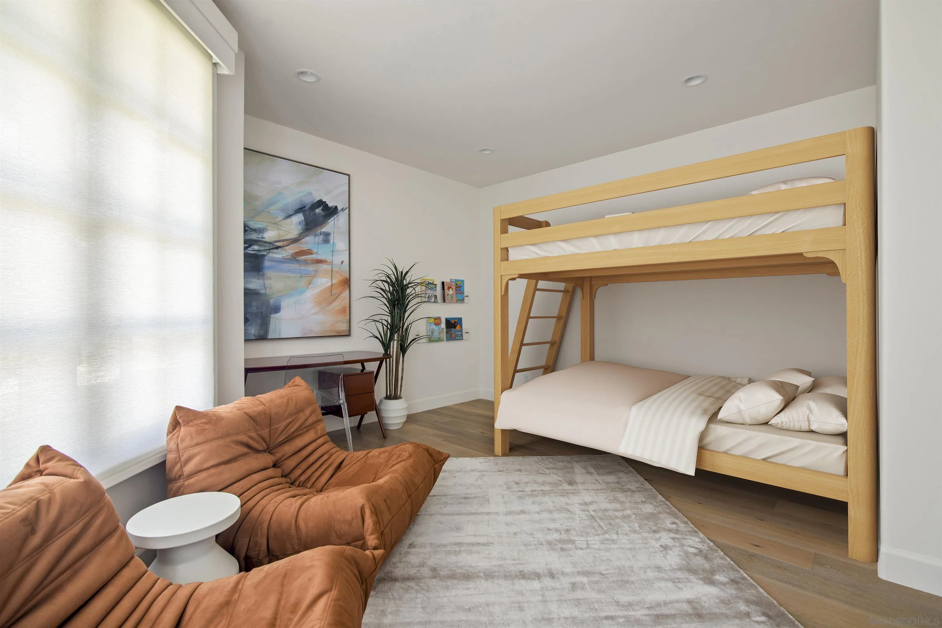 This stylish 3-bedroom, 2.5-bath townhome is located in the highly walkable and vibrant La Jolla Village neighborhood, just minutes from the beach, local dining, shops, and coastal trails. With thoughtfully designed interiors and high-end finishes throughout, the home offers an ideal setting for long-term stays in one of San Diego’s most desirable seaside communities. The main floor features an open-concept living space filled with natural light, a comfortable sectional sofa, a fireplace, and curated artwork that adds a warm, contemporary touch. The adjacent dining area leads into a sleek, modern kitchen with marble countertops, a center island, and premium appliances. French doors open to a private patio, perfect for relaxing or entertaining, with stylish outdoor furnishings and lush greenery providing a serene atmosphere. Upstairs, the primary suite offers a king bed, vaulted ceilings, a fireplace, a wall-mounted TV, and an ensuite spa-like bathroom with a soaking tub, dual vanities, and a walk-in shower. The second bedroom includes a queen bed, while the third bedroom features a full bunk bed and a cozy setup ideal for kids or visiting guests. A second full bathroom upstairs, and a powder room on the main level adds extra convenience. The home includes central air conditioning and heat, in-unit laundry, two garage parking spaces (with key access), and driveway parking. No pets are allowed. A 30-night minimum stay is required. Sleeping Accommodations (Maximum Occupancy 6): Bedroom 1 - 1 King bed - Bedroom 2 - 1 Queen bed - Bedroom 3 - 1 Bunk Bed - There are 2.5 bathrooms.