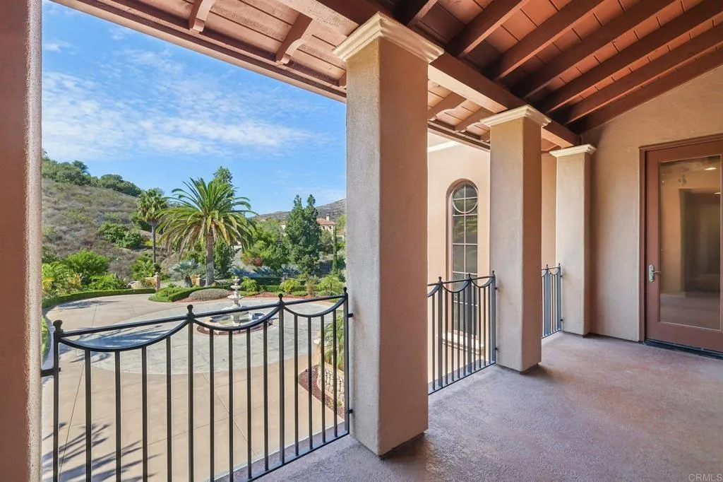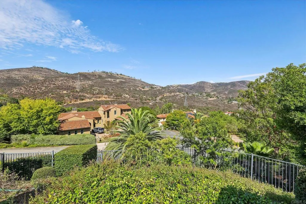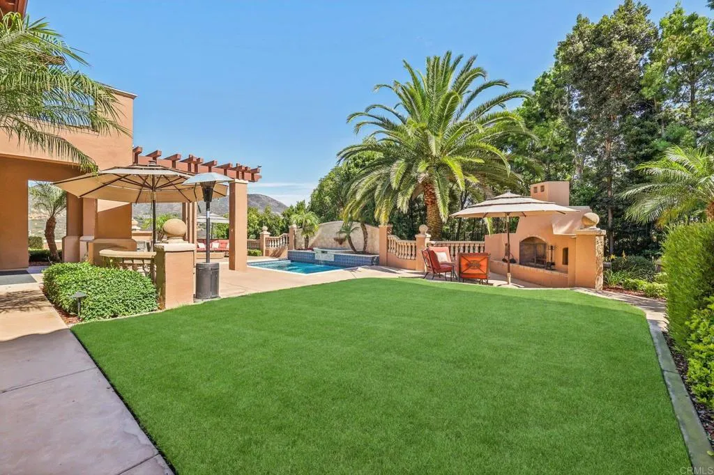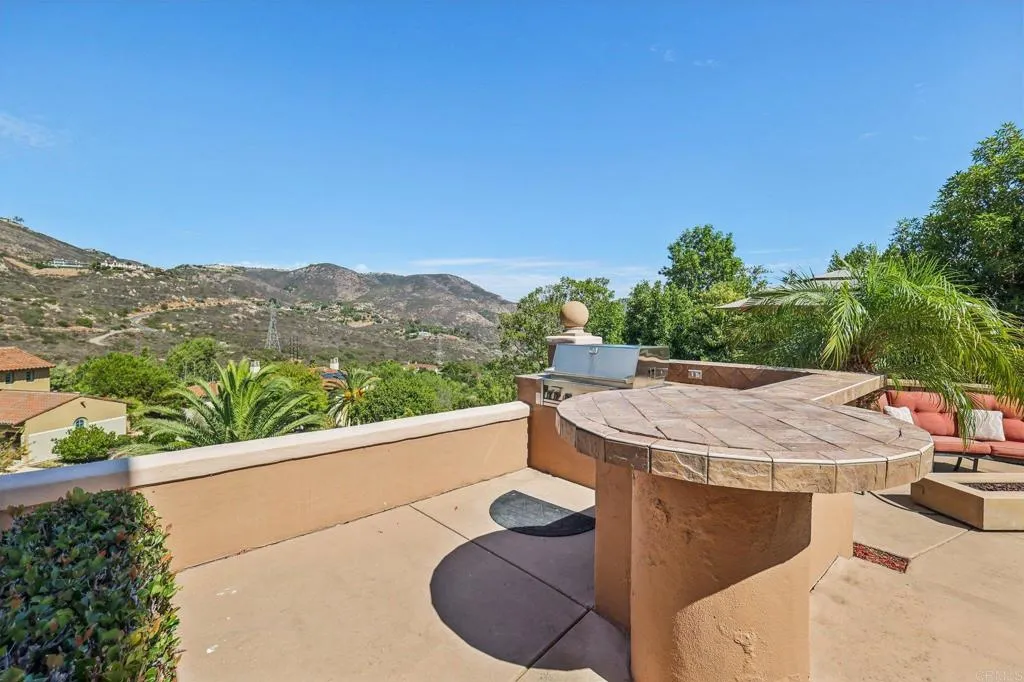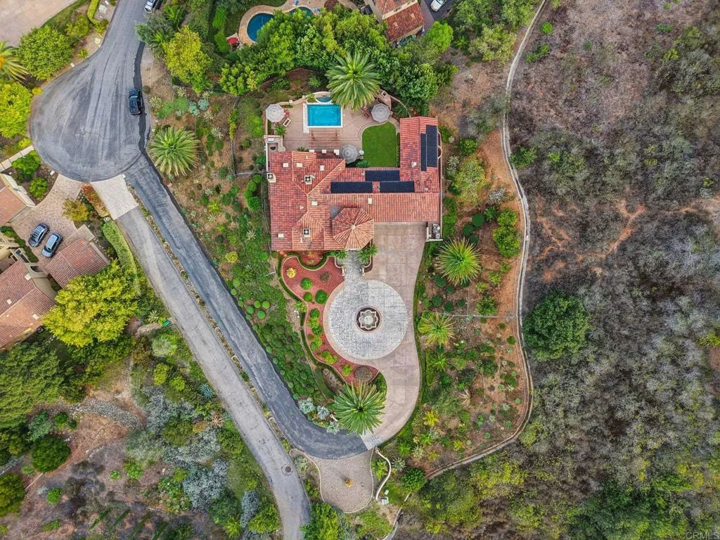 This private Mediterranean estate is set on an elevated 1.13-acre lot with sweeping mountain views at the end of a cul-de-sac in the prestigious guard-gated Cielo community within the highly sought-after R Roger Rowe School boundaries. Main residence offers 5 bedrooms, 3.5 baths, theater room, office, upstairs bonus room, along with an attached ADU that has a bedroom and bath. Grand driveway ascends to a circular motor court, where a meticulously landscaped yard and stunning fountain create a dramatic stage for arrival. Soaring two-story foyer with hardwood floors and a sweeping staircase welcome you. Formal living room has a fireplace framed by arched doorways, while the neighboring office is finished with custom built-ins. Kitchen features white cabinetry, a large center island, premium appliances, and daily dining that flows seamlessly into the family room with fireplace. Formal dining room and powder room complete the main level. Upstairs, primary suite offers a fireplace with raised hearth, private balcony, a spa-inspired bath with dual vanities, soaking tub, walk-in shower, and an expansive walk-in closet. Three additional bedrooms, 2-baths, laundry room, and bonus room complete the main residence. Attached ADU has a private entrance, full kitchen, living room, bedroom, and bath. Backyard is designed for entertaining with an oversized spa and cascading water feature, built-in BBQ island, fireplace, pergola, and multiple seating areas all surrounded by lush landscaping and mountain views. Entertainment continues with a private theater with separate exterior access. Add