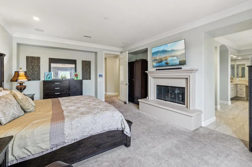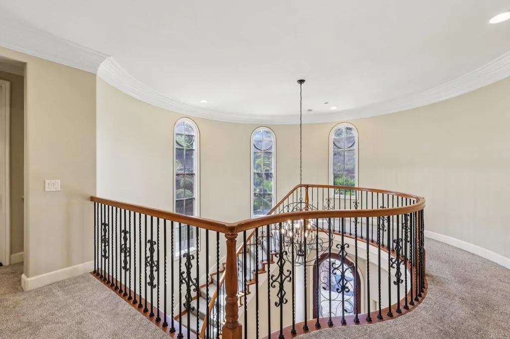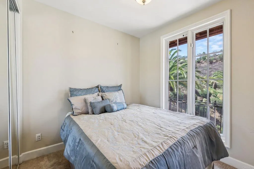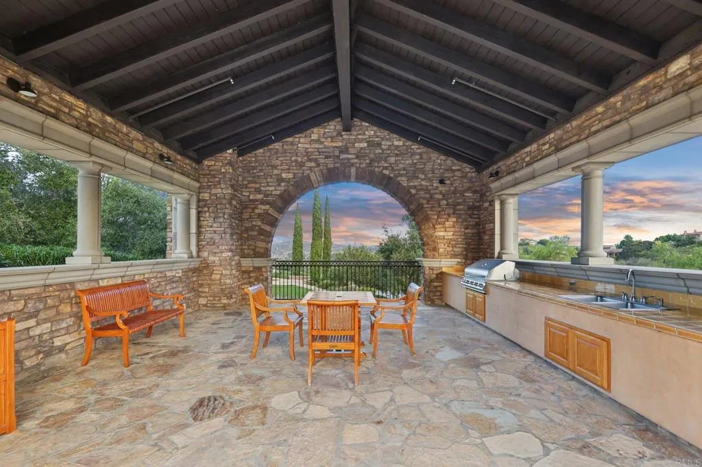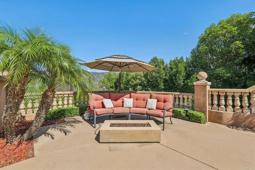 This private Mediterranean estate is set on an elevated 1.13-acre lot with sweeping mountain views at the end of a cul-de-sac in the prestigious guard-gated Cielo community within the highly sought-after R Roger Rowe School boundaries. Main residence offers 5 bedrooms, 3.5 baths, theater room, office, upstairs bonus room, along with an attached ADU that has a bedroom and bath. Grand driveway ascends to a circular motor court, where a meticulously landscaped yard and stunning fountain create a dramatic stage for arrival. Soaring two-story foyer with hardwood floors and a sweeping staircase welcome you. Formal living room has a fireplace framed by arched doorways, while the neighboring office is finished with custom built-ins. Kitchen features white cabinetry, a large center island, premium appliances, and daily dining that flows seamlessly into the family room with fireplace. Formal dining room and powder room complete the main level. Upstairs, primary suite offers a fireplace with raised hearth, private balcony, a spa-inspired bath with dual vanities, soaking tub, walk-in shower, and an expansive walk-in closet. Three additional bedrooms, 2-baths, laundry room, and bonus room complete the main residence. Attached ADU has a private entrance, full kitchen, living room, bedroom, and bath. Backyard is designed for entertaining with an oversized spa and cascading water feature, built-in BBQ island, fireplace, pergola, and multiple seating areas all surrounded by lush landscaping and mountain views. Entertainment continues with a private theater with separate exterior access. Add