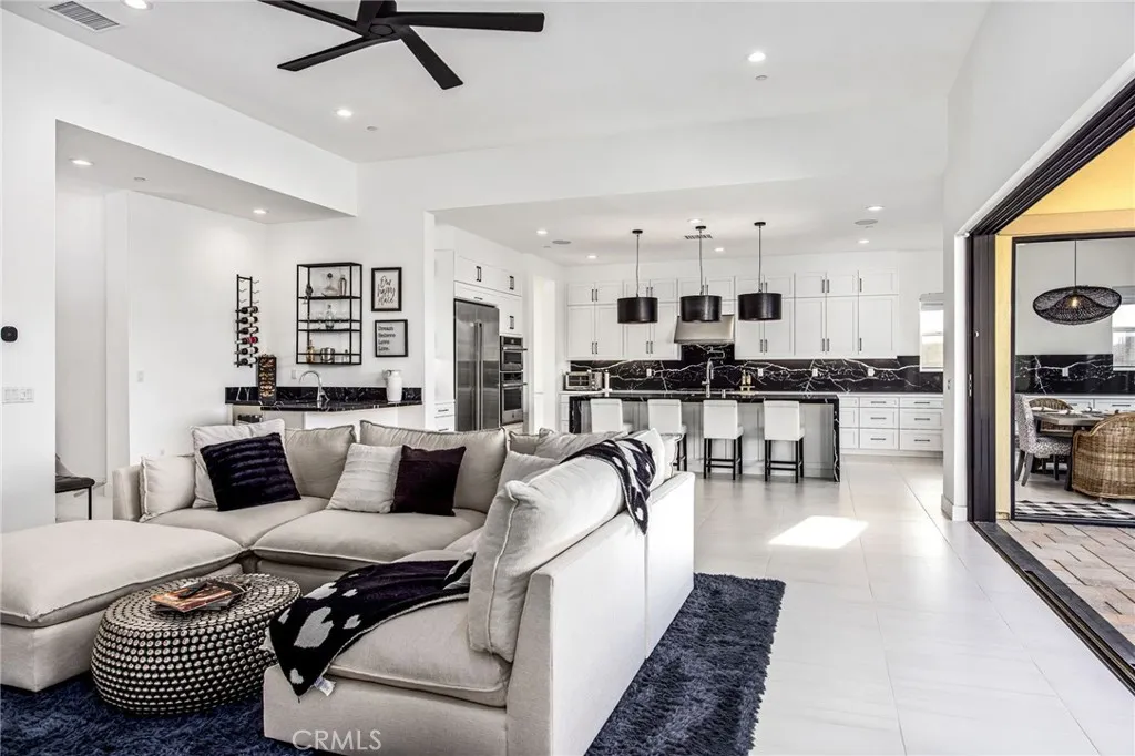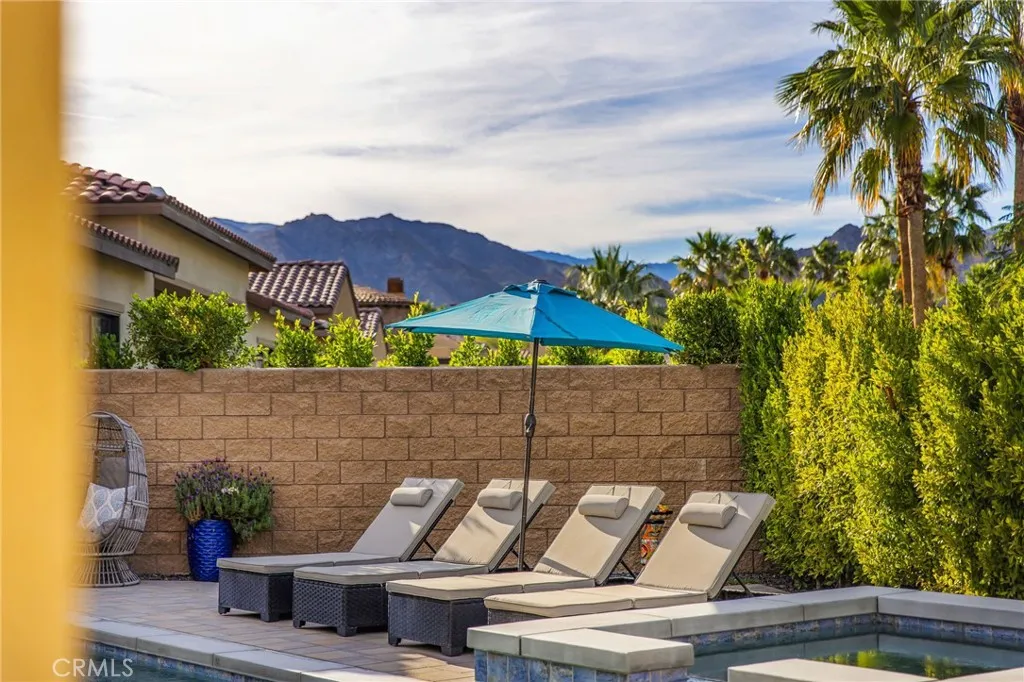 Nestled within the sought-after community of Stone Creek Ranch in South La Quinta, this newly built Toll Brothers Larrea model showcases contemporary design, quality craftsmanship, and effortless indoor-outdoor living just minutes from PGA West. Thoughtfully designed for both everyday comfort and entertaining, the open concept floor plan features soaring ceilings and expansive stacking glass doors that seamlessly connect the interior living spaces to a professionally landscaped backyard. Outside, enjoy pavers, artificial turf, mountain views, a built-in fireplace, fire pit, multiple seating areas, and generous side yards offering added flexibility for recreation or future use. The kitchen serves as the heart of the home, appointed with waterfall-edge countertops, premium JennAir smart appliances, custom cabinetry, a spacious walk-in pantry, and dedicated coffee and wine bars complete with a built-in refrigerator. This home features a wide array of Toll Brothers builder upgrades, thoughtfully selected to enhance both style and functionality while maintaining a cohesive, high-end aesthetic. Custom window treatments and elevated finishes continue throughout. Designed with privacy in mind, the floor plan separates the primary suite from the guest bedroom and office. The spacious primary retreat offers oversized closets, dual vanities, and spa-inspired finishes. A dedicated office provides versatility for remote work, a home gym, or creative space. Thoughtful built-ins and well-planned cabinetry deliver abundant storage throughout. Additional features include paid solar, energy-