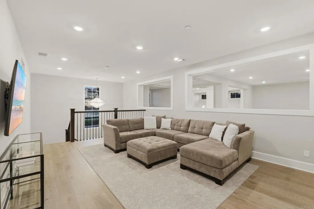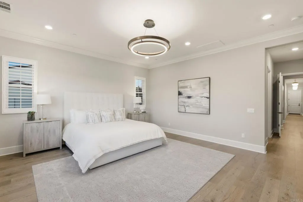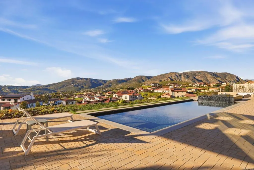 Come experience the pinnacle of refined living in one of North Countys most coveted enclaves, The Lakes Above Rancho Santa Fe. Set within the exclusive Sterling Heights collection, this exceptional estate is gracefully positioned atop a private ridge, capturing sweeping panoramic views across the Santa Fe Valley and stretching west toward Del Mar and Solana Beach. Situated on over half an acre, the residence offers nearly 5,000 square feet of thoughtfully curated living space, encompassing five generously proportioned bedrooms and five-and-a-half baths. A grand entry with soaring ceilings introduces an airy, light-filled interior where refined finishes and architectural detail define each space. The open-concept design seamlessly connects the formal dining room, expansive great room, and gourmet kitchen creating an effortless flow for both intimate gatherings and large-scale entertaining. The chefs kitchen is a statement in both style and function, featuring dual oversized islands that are perfect for culinary adventures and hosting guests. Contemporary porcelain tile backsplashes add a beautiful designer touch. The adjoining family room is anchored by a striking fluted marble fireplace, complemented by custom built-ins, shiplap detailing, and a board-and-batten feature wall blending warmth with modern sophistication. The main-level primary suite is a private sanctuary, framed by tranquil valley views. Its spa-inspired bath offers dual vanities, an oversized soaking tub, and a serene palette of soft greys and whites. A custom-designed walk-in closet with center island provi