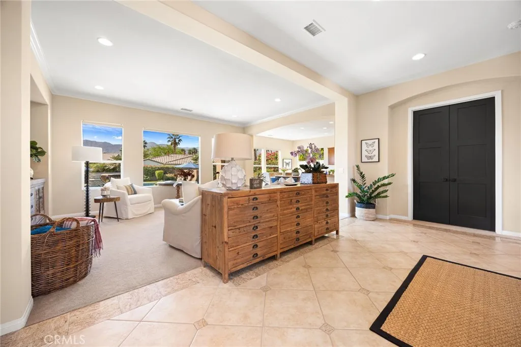 RESORT STYLE BACK YARD ON A PREMIUM LOT! MOUNTAIN VIEW! Located in the highly sought-after 55+ community of Trilogy at La Quinta, this reimagined Oreas floor plan is a true standout. The entry fireplace has been removed so the moment you step through the front door, you're welcomed by a wide-open great room that offers an immediate and breathtaking view of the resort-style backyard with mountains as the backdrop. The formal dining room has been thoughtfully enclosed and connected to the guest bathroom, providing another bedroom ideal for visitors. This versatile layout now features 3 bedrooms, a den/office off the entry, and a generous retreat off the primary suitelarge enough to serve as a home office, gym, additional guest space or create a dream closet. High ceilings at 10 feet and 8-foot doors throughout enhance the sense of openness and luxury. Set on a premium lot, the backyard is your own private oasis. The saltwater pebble-finish pool and spa anchor a space designed for the ultimate in outdoor living. Enjoy a custom in-pool dining table, tanning ledge with lounge chairs, an in-pool curved conversation bench, a tranquil waterfall, and lush tropical landscaping. Enjoy shaded comfort under a covered patio with an added large retractable awning (with wind sensor), two ceiling fans, a built-in fire-pit, and natural gas BBQ hook up. The gourmet kitchen features double islands, pantry, granite countertops, stainless steel appliances, and a premium Wolf gas cooktop. The primary bedroom overlooks the backyard and mountains and has direct access to the back yard. Its en-suite