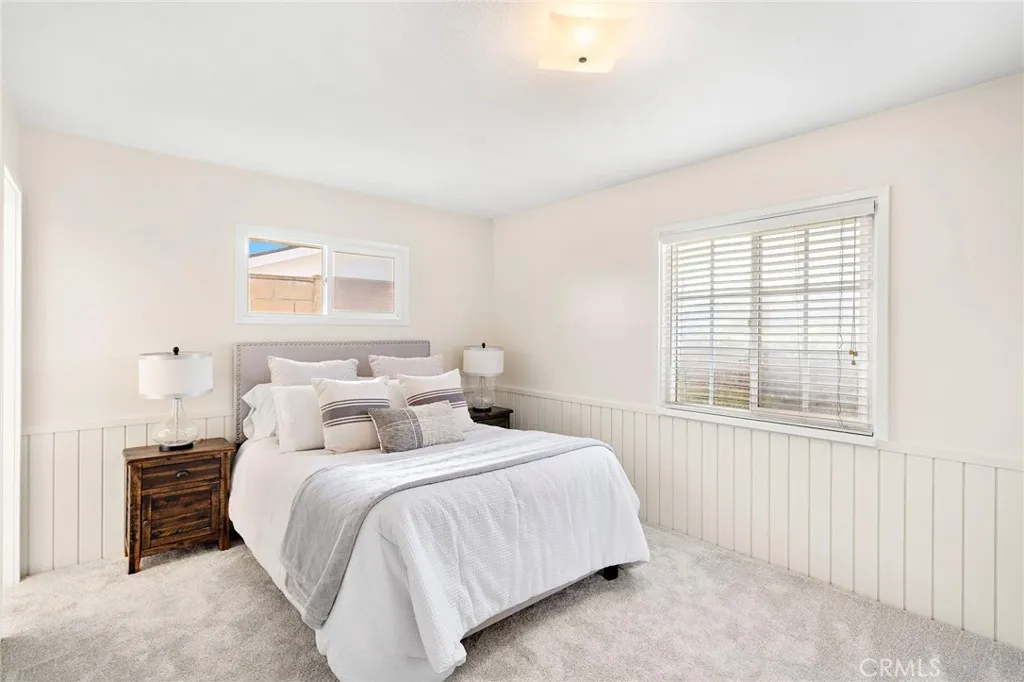 Welcome to this charming single story home nestled in a quiet interior location in the heart of Surf City USA, offering 4 bedrooms, 2 bathrooms, and nearly 1,600 square feet of warm, inviting living space that has been lovingly maintained over the years and thoughtfully refreshed with newly painted interior paneling for a bright, updated feel. This turnkey residence showcases pride of ownership with beautiful curb appeal featuring manicured landscaping, a lush front lawn, raised flower planters, and a welcoming brick front patio perfect for greeting neighbors. Inside, youll find a spacious dining room with wood laminate flooring, a garden window, and stunning handcrafted custom woodwork including floor-to-ceiling decorative paneling, built-in display cabinetry, and a buffet serving station that creates an ideal setting for gatherings and holiday entertaining. The adjacent living room offers a cozy fireplace, and the kitchen is equipped with a brand new gas range, Corian countertops, breakfast bar, and direct access to the side and backyard. The expansive family room addition provides versatile extra living space with updated white paneled walls and dual sliding glass doors opening to both a private side patio and a tranquil backyard with block wall fencing, raised planters, grassy lawn, and a large patio area perfect for outdoor dining, relaxing, and entertaining. The primary suite features charming custom wainscoting, a cedar-lined mirrored closet, and an ensuite bath with tiled shower and mirrored accent wall. Three additional bedrooms offer fresh paint and overhead light