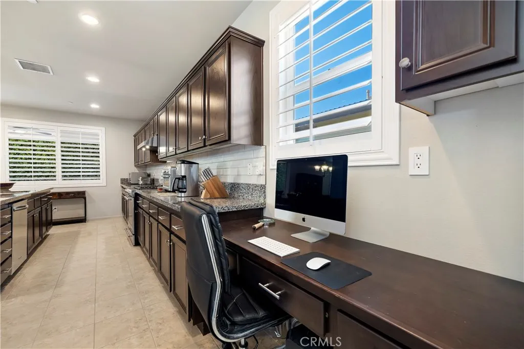Single story, move in ready home in the gated Palazzo community, perfectly situated on a serene corner lot adjacent to a lush greenbelt. This inviting residence offers a great floor plan with 3 bedrooms, 2.5 bathrooms, plus a den, and spacious living and dining areas that flow seamlessly into a gourmet kitchen featuring granite countertops, ample cabinetry, a walk-in pantry, stainless steel appliances including a full-sized fridge, and a large island perfect for gathering and entertaining. Adjacent to the main living area, a den or office showcases a full wall of custom library-style built-ins. Recessed lighting, plantation style window shutters throughout, and newer ceiling fans enhance the bright, airy feel of the home. Sliding glass doors from the main living area open to a covered patio and a secluded backyard with mature landscaping and matching storage shed, creating an effortless connection between indoor and outdoor living and an ideal space for relaxing or entertaining. Just off the kitchen, a dedicated laundry room conveniently located between the kitchen and the garage features a washer and dryer, utility sink, and built-in cabinets for additional storage. As you move down the hallway, the primary suite is tucked into its own private wing, separated from the other bedrooms for added privacy, with dual vanities, a soaking tub, a separate shower, and a spacious walk-in closet. Two additional bedrooms are located in a separate hallway and share a nearby full bathroom, along with a conveniently located guest powder room. The home also offers direct access to the atta