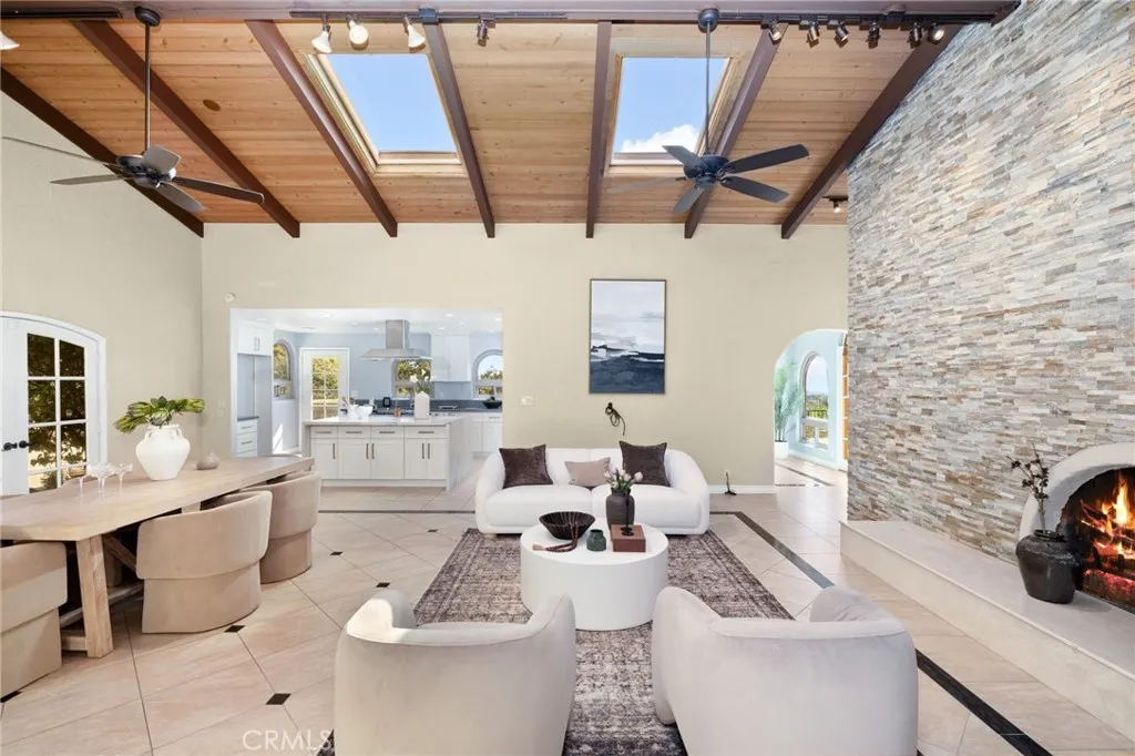 Located at the end of a quiet cul-de-sac in the prestigious Claraboya neighborhood of north Claremont, 821 Guanajuato Drive is a beautiful Spanish-style estate offering exceptional privacy and breathtaking mountain, valley, and city-light views. Set on an expansive 1.29-acre lotthe largest in the communitythis rare property blends timeless architecture with thoughtful modern upgrades. Double leaded-glass entry doors open to a dramatic foyer with soaring ceilings and an open, flowing floor plan filled with natural light. Formal living and dining areas are framed by walls of windows and enhanced by rich architectural details, including wood-beamed ceilings, decorative niches, and multiple fireplaces. The spacious great room features skylights and French doors that seamlessly connect indoor and outdoor living. The remodeled kitchen showcases an oversized quartz island and premium Thermador appliances, opening to a breakfast nook and family areaall positioned to capture the homes stunning views. The primary suite opens to the private courtyard with relaxing jacuzzi. The expansive grounds feature multiple patios, built-in barbecue, and beautifully landscaped front and back yards with mature fruit trees and edible plantings, creating an inviting garden-to-table lifestyle. A large flat grassy area offers ample space for recreation, gatherings, or future expansion, with potential for additional structures such as a guest house, casita, or private retreat. Additional highlights include two SolarCity solar systems with a fixed Tesla energy rate of approximately $0.15/kWh, a full PEX