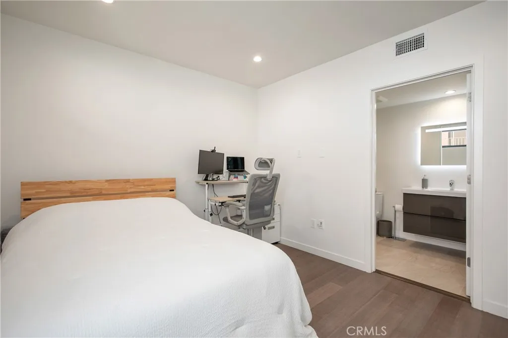 Welcome to 823 N Fuller Ave #E, A modern townhouse-style condo in the heart of West Hollywood, offering three levels of light-filled living with floor-to-ceiling windows and an open-concept layout. The entry level features a laundry area, storage, and two en-suite bedrooms, including a spacious primary suite with a walk-in closet and a large bath with dual-sink vanity. Upstairs, the main living level flows seamlessly through the living and dining areas into the chefs kitchen. Complete with a contemporary fireplace, skylight, expansive island, extensive cabinetry, and Bosch stainless steel appliances, plus a convenient powder room for guests. Top it all off with a private rooftop patio with city & hill views, ideal for dining and/or entertaining. Quiet street location north of Melrose and west of La Brea, moments from Poinsettia Park, Trader Joes, Melrose shopping/dining, and the best of WeHo/Beverly Grove, with easy access to Santa Monica Blvd and the Sunset Strip.
