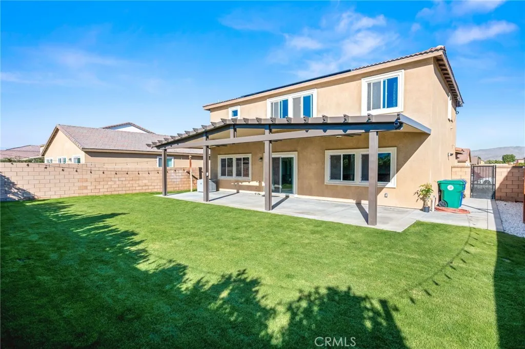 Welcome to Mariposa Pointe, one of Coachella's newest communities. This North-South facing 2239 sf two story home was built in 2023 and the current owners have already made it move-in ready for you! From the fully landscaped, water saving front yard and rear with well cared for lawn, privacy shrubbery, added side walkway, the patio concrete pad and absolutely beautiful Gable style patio cover for your enjoyment! The front covered porch welcomes you into a freshly painted, very open downstairs which includes a large bedroom and full bathroom, A nicely laid out living-dining and kitchen area with white cabinetry, Granite countertops, kitchen island, pantry and Stainless steel appliances. As you make your way upstairs, a large open Loft area connects to the large primary bedroom with its own large bathroom area and walk in closet as well as the other two bedrooms and additional full bathroom and spacious laundry room with additional storage closet. This home is equipped with Smart Home Technology, the many features that you can control from your phone, whether you're home or away. Other things: A leased Solar panel system for energy saving, a Tankless water heater, Energy saving LED lighting and fire sprinklers.