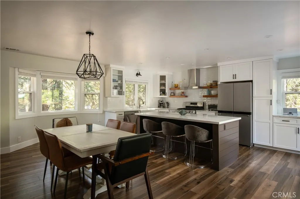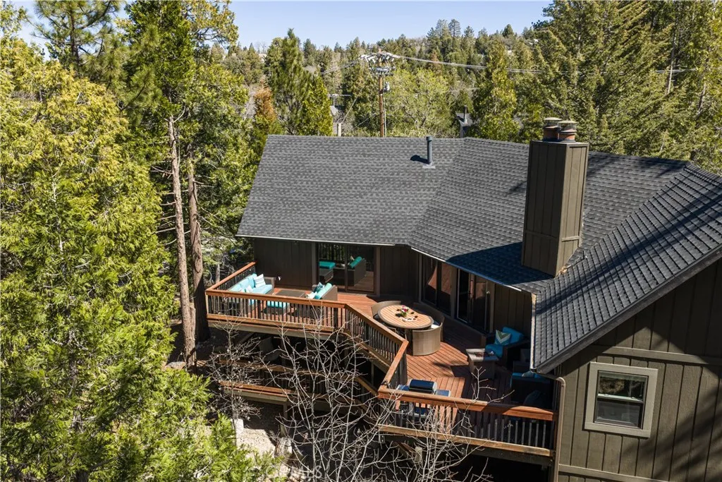 Introducing The Pinecrest Retreata refined modern mountain residence set on a coveted corner lot, where thoughtful design meets effortless living beneath a canopy of towering pines. This home does come with lake rights to Lake Arrowhead & has newly installed AC in 2022. Beautifully reimagined with a focus on both style and functionality, this home offers an ideal floor plan with the primary suite located on the main level alongside the kitchen and main living spaces, creating true single-level living rarely found in mountain homes. Downstairs, a spacious secondary family room and two well-appointed guest bedrooms provide the perfect layout for hosting while maintaining privacy and comfort for both owners and guests. Ideally positioned, the home includes highly sought-after lake rights to Lake Arrowhead and is just a golf cart ride away from the Lake Arrowhead Country Club, offering convenient access to golf, dining, and one of the areas most desirable lifestyle amenities. Inside, rich wide-plank wood flooring, vaulted wood-beamed ceilings, and curated finishes create a warm yet elevated atmosphere that feels both inviting and sophisticated. The main living room is anchored by a striking stone fireplace and framed by expansive sliding glass doors that flood the space with natural light and seamlessly connect indoor and outdoor living. The kitchen flows effortlessly into the dining and living areas, making it ideal for everyday living, entertaining, and gathering with family and friends. The primary suite is a true retreat, offering peaceful forest views, direct access to the