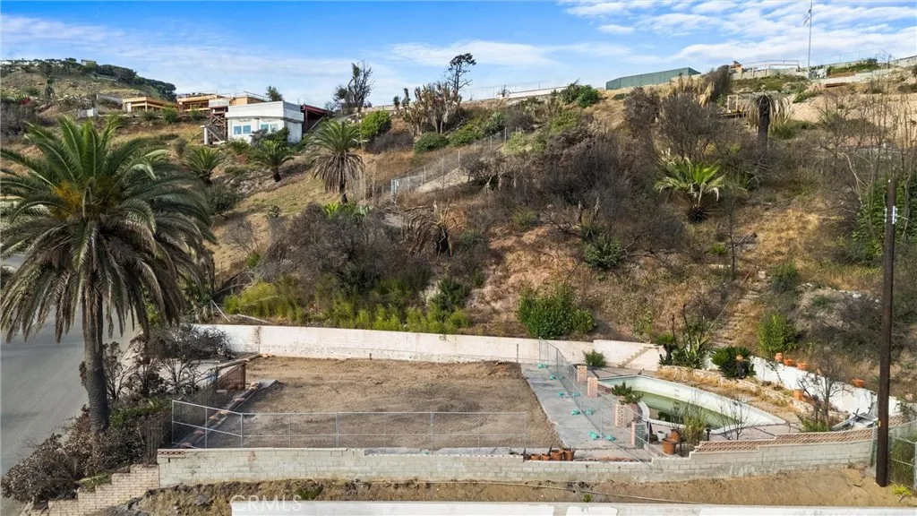 Discover this exceptional half-acre lot in Pacific Palisades, perfectly perched on its own level. This parcel offers unmatched seclusion and breathtaking Catalina views on a clear day, as well as full ocean views from many areas and rooms. Fully certified completion of Phases 1 and 2 by the Army Corps of Engineers. Spanning nearly 24,000 square feet, the lot is ideal for a large home with expansive outdoor living areas, including patios and landscaped gardens. The existing former footprint is approximately 3,000 square feet, allowing for up to 6,000 square feet on two levels. The gently sloping hillside is highly accessible, featuring established trails that lead to a scenic hilltop vista and tranquil rest spot. Additionally, there is potential to extend the build area into the hillside, providing unique opportunities for creative design and functional use of the terrain. A sizable mid-century modern pool remains on-site, awaiting refinement to become a stunning outdoor centerpiece. Situated just moments from the future and newly reconstructed Marquez School, the property offers convenient access to scenic walking trails, panoramic vistas, and outdoor recreation. Elevated above street level, the parcel ensures complete privacy, with no neighboring properties on either side, making it an ideal blank canvas to realize your dream home in one of the most prestigious neighborhoods in Pacific Palisades.