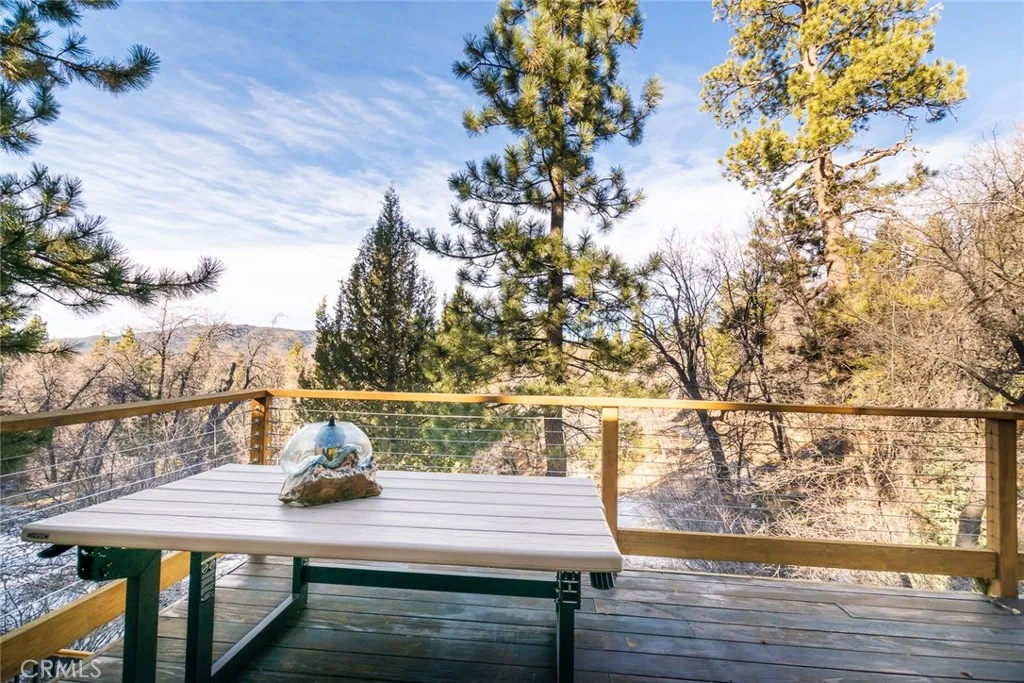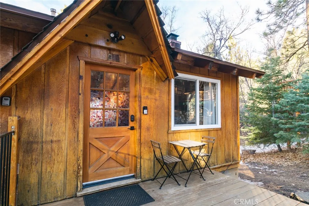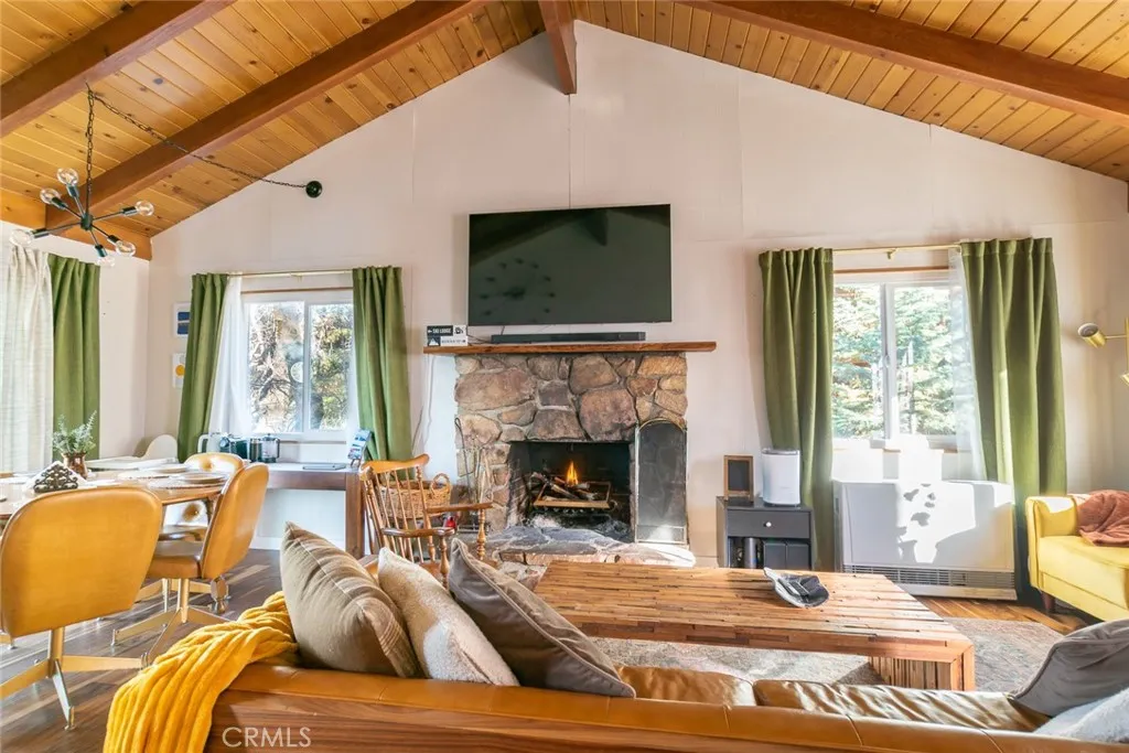Nestled in a peaceful Moonridge setting with unobstructed mountain and tree views, this charming Sierra-style cabin offers the perfect mountain retreat. Tucked away from the street for added privacy, the home captures the cozy getaway atmosphere buyers are looking for in Big Bear. The open-concept living area features beautiful new hardwood flooring, vaulted beam ceilings, a classic brick fireplace, and an open kitchen that flows naturally into the living spaceideal for relaxing or entertaining. Two spacious bedrooms, an updated full bathroom, and abundant natural light complete the inviting main level. Recent upgrades include all new dual-pane windows, a new electrical panel, and an additional heating system, improving both comfort and energy efficiency. The spacious basement, accessible via an interior stairwell, includes a bath with laundry area, a separate wall heater, and a dual-pane sliding door that opens to its own private deck and backyard. While the basement is not permitted as living space and is not included in the square footage, it has been used as additional family space, a game room, and extra storage. Enjoy the outdoors from both the upper and lower decksperfect for BBQs, entertaining guests, or simply unwinding while taking in the beautiful mountain scenery. A newer south-facing parking pad offers level parking for two vehicles, with convenient access to the home via durable metal-grate and concrete steps. Located just minutes from Bear Mountain Ski Resort, Big Bear Alpine Zoo, shopping, the lake, and the Village, this property offers both convenience and