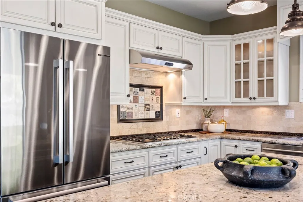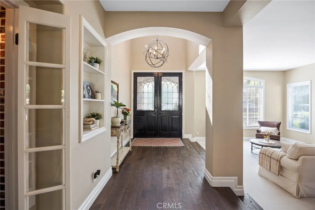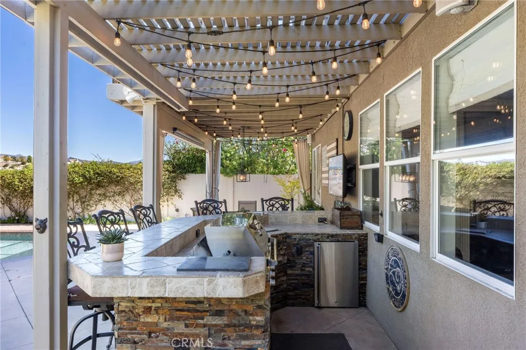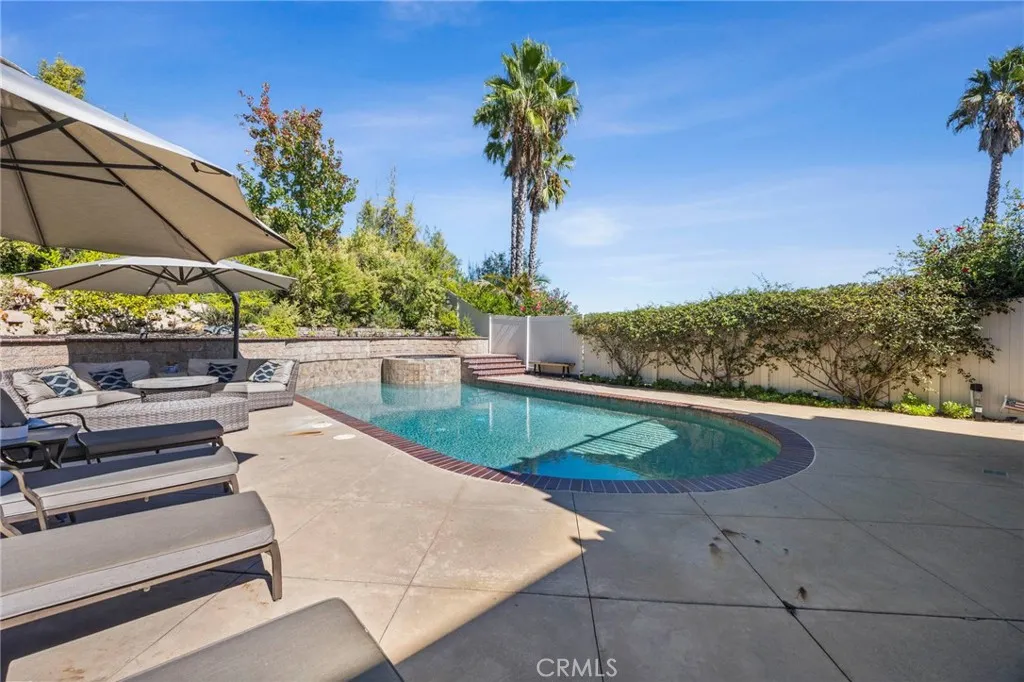 Welcome to your private resort-style retreat! This stunning 5-bedroom, 3-bath home with a huge great room sits on a beautifully manicured corner lot and offers exceptional curb appeal. Double door entry welcomes you into an inviting, light-filled interior with high ceilings and an open layout. The expansive kitchen is a chef's dream, featuring a large center island, abundant storage, custom cabinetry, and a spacious eating area that opens to the family room, perfect for both everyday living and entertaining. Enjoy cozy evenings by the fireplace or host memorable gatherings with ease. This home also features a main-floor bedroom and a full bath, ideal for guest or multigenerational living. The formal dining room boasts French doors that open to a charming garden patio, while the wine room also adds a special touch. Upstairs, the luxurious primary suite features a large private balcony with beautiful, panoramic views. The additional bedrooms are spacious and a large bonus room provides endless possibilities-game room, home theater, or home office. Hardwood floors, French doors, custom built-ins, neutral plush carpet, several fruit trees, and incredible attention to detail await. Step outside to your resort-style yard, an entertainer's paradise with a sparkling pool and spa, built-in BBQ & bar, plenty of lounging & dining areas, and still a large grass area. Whether you're hosting summer BBQs or enjoying peaceful nights at home, this dream yard has it all. Truly a rare opportunity to own a home that offers luxury, comfort & lifestyle all in one perfect package. No mello roos,