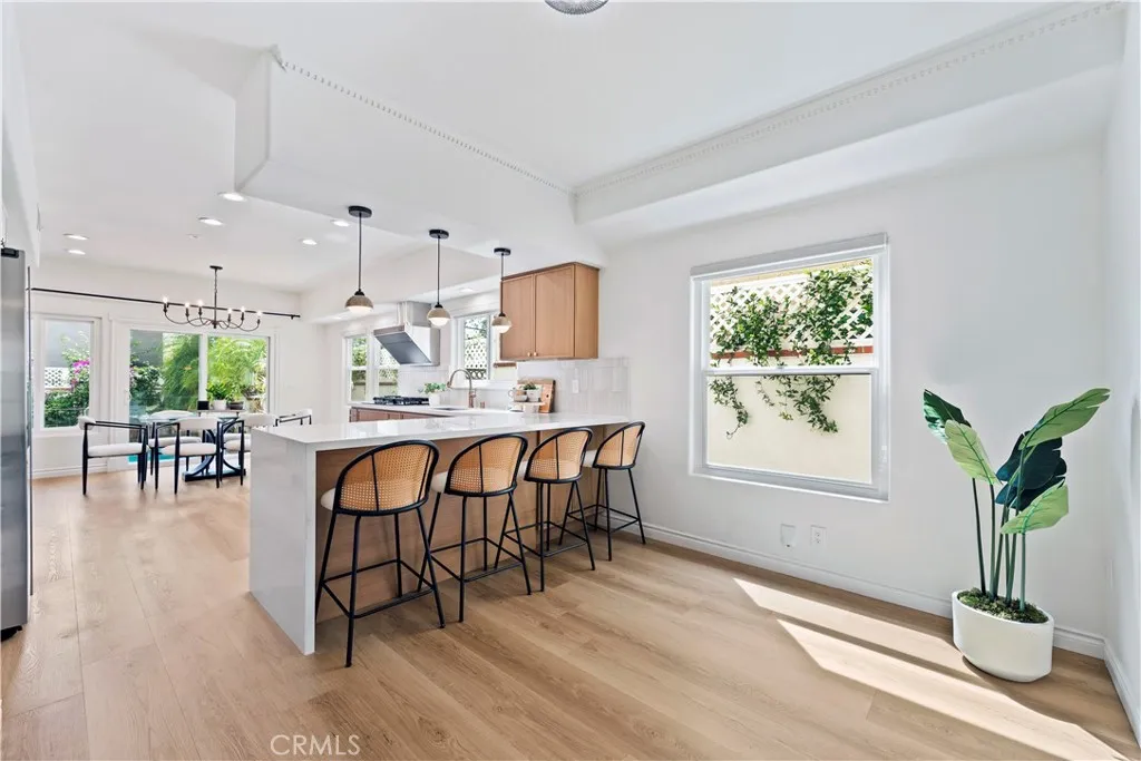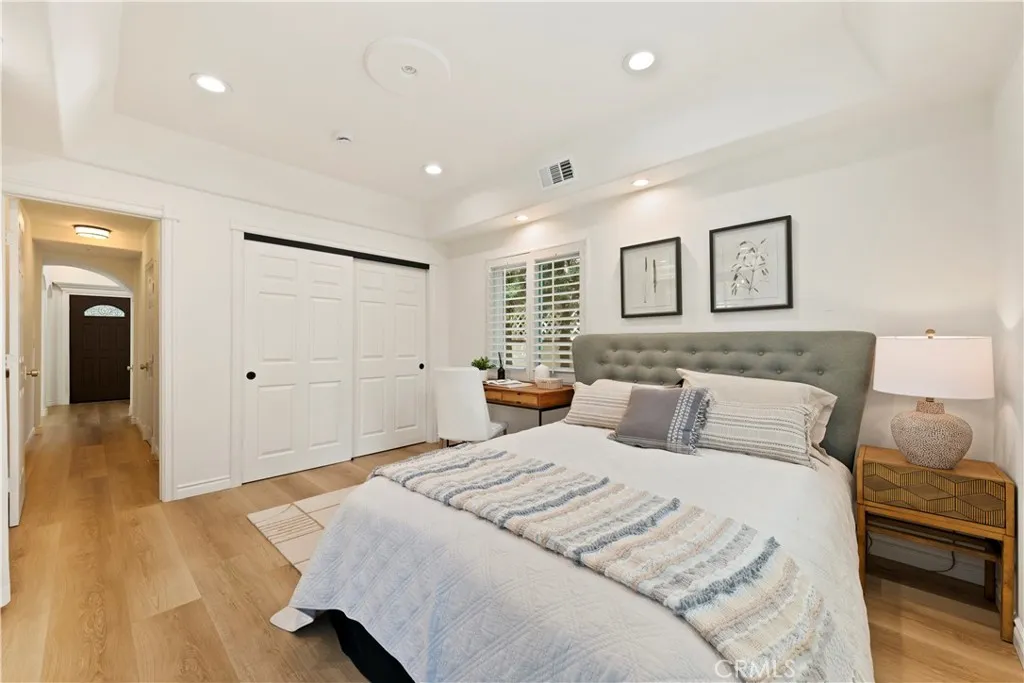 Rare opportunity to own a beautifully renovated character home blending timeless architecture with modern comfort. Fully updated in 2025, this architecturally distinctive property offers flexible living as a spacious single residence or two separate living spaces with potential ADU use (buyer to verify). The front home features 3 bedrooms, including a stunning primary suite with 11-ft ceilings, fireplace, crown molding, walk-in closet, laundry area, and a serene sitting retreat overlooking the sparkling pool, hills, and mature palm trees with a charming Juliet balcony. A second en-suite bedroom offers elegant arched windows and abundant natural light, while the third bedroom with French doors to the backyard can function as a family room, office, or studio. A dramatic 21-ft foyer with sweeping curved staircase leads to a formal living room with vaulted beam ceilings, fireplace, and custom sliding doors opening to the dining and kitchen areas. The kitchen features two-tone cabinetry, modern appliances, and a quartz island overlooking the pool and garden. The rear unit includes a bedroom, full bath, kitchen, living area, laundry, and private rooftop terrace with sunset views. Energy-efficient windows and doors throughout. Located in a desirable, quiet, safe neighborhood. No Mello Roos. No HOA.