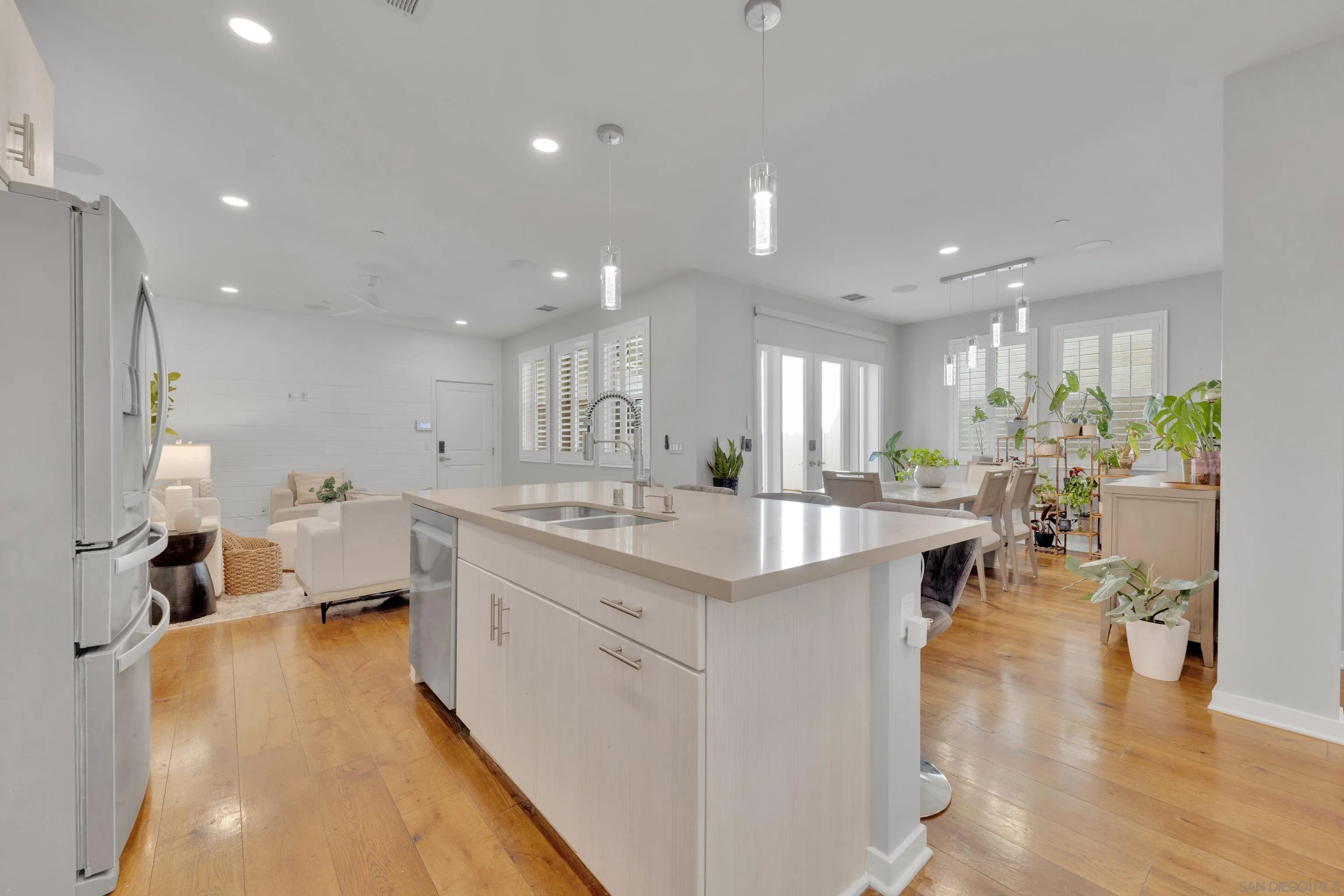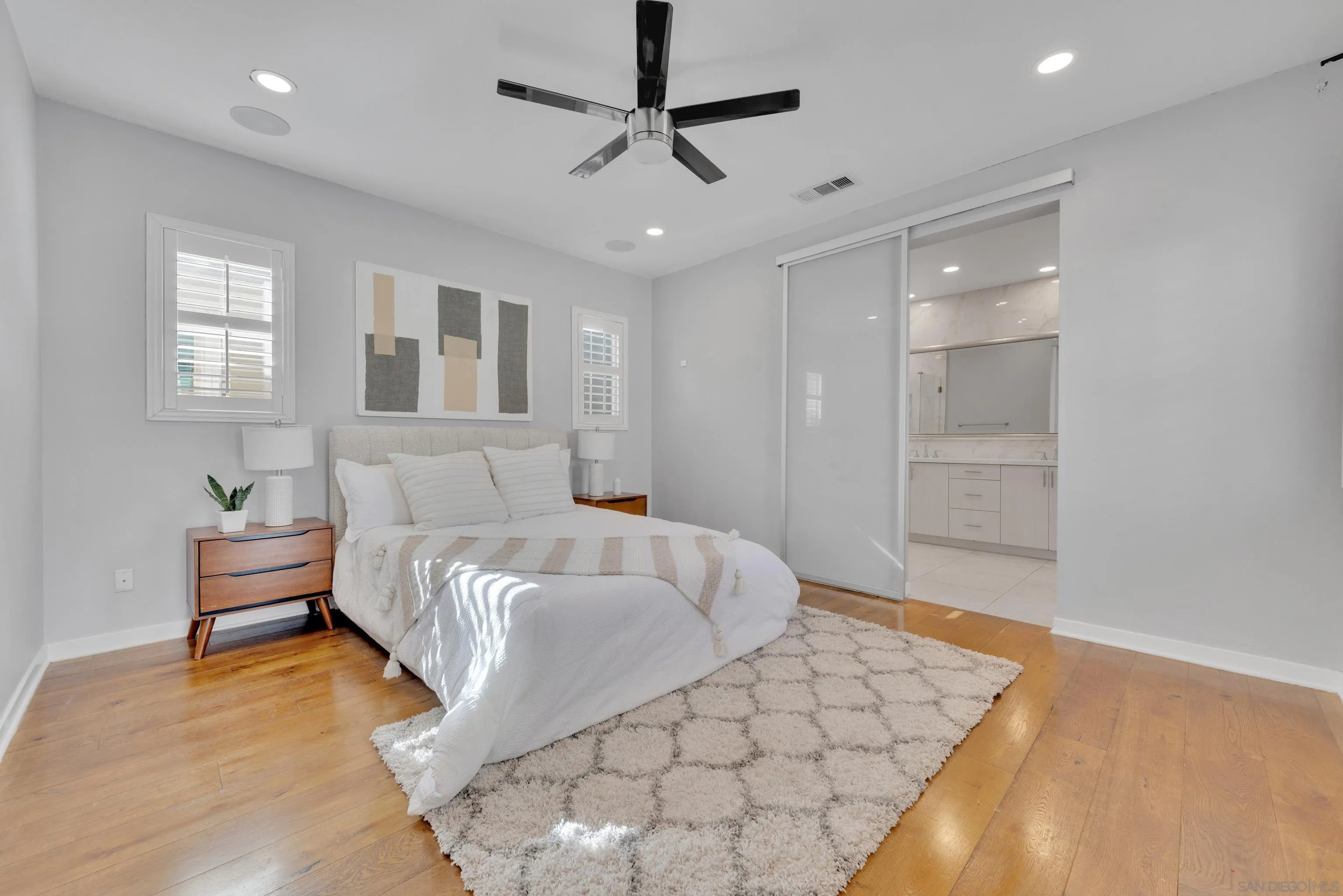 Welcome to this beautifully upgraded former model home. Reap the benefits of paid solar and real hardwood floors with no carpet in this house. Ask about the potential VA assumable loan. A downstairs bedroom with full bath offers a walk-in shower ideal for guests, multigenerational living, or a home office. All 3 Bathrooms are stylishly upgraded with custom artisan tile. High-end finishes are showcased throughout, including custom plantation shutters on every window, modern cabinetry, quartz counters, full-tile backsplash, and designer lighting. The open-concept kitchen, large island, and living areas provide direct access to a private outdoor space with TV. Upstairs, the spa-inspired primary suite offers a relaxing retreat with a luxurious bath and generous closet space. A 2 1/2 Car Garage with epoxy floors, extra built-in storage and space for a hobby will bring a smile to your face. Ideally located directly across from the resort-style pool, lap-pool, recreation center, huge community gym, and expansive park. This home offers the perfect blend of comfort, design, and community living. Providing a seamless flow for everyday living and entertaining. Take advantage of community organized workshops, socials, group workouts, and Holiday events multiple times a month. Walking distance to Escaya’s own K-6 Elementary School, dog parks, neighborhood dining, coffee shops, and market. Only minutes from Otay Ranch Town Center, Sesame Place, NICU Amphitheater, and major freeways.