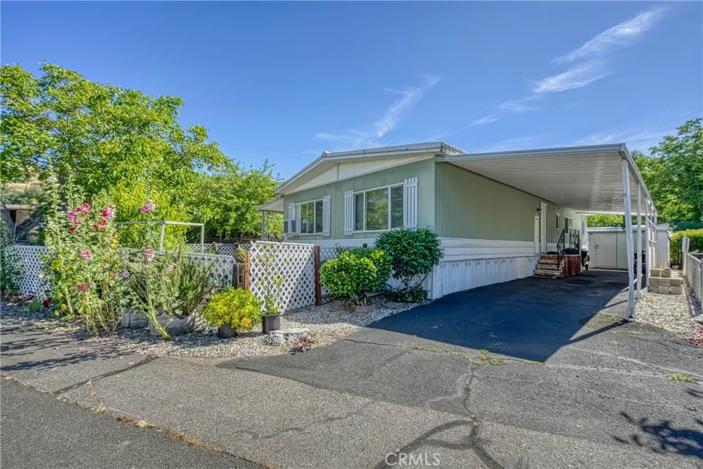 This delightful 1975 double-wide mobile home is situated in a 55+ Senior Park in downtown Lucerne Ca. Upon entering, you will be greeted by a spacious and open floor plan designed for both functionality and comfort. The living area has ample natural light and includes a cozy dining area with a built-in hutch. There is an additional space in the living area which could easily function as a home office or additional dining space. The charming kitchen has a electric cooktop stove, dishwasher, refrigerator, dual sink, plenty of counter space with an Island and cabinets. There are two generously sized bedrooms and the spacious primary bedroom includes an En-Suite bath. There is also a 3/4 guest bath. Both bedrooms have walk in closets. The laundry area with plenty of cabinets also includes a washer and dryer. Double pane windows. The central heating and air conditioning make for a consistently comfortable atmosphere. Large front porch is perfect for relaxing and enjoying the rural setting. Detached shed provides plenty of storage or extra workspace. Fenced yard all around with a low maintenance yard. A covered front porch and a covered carport with a paved driveway. Easy to maintain yard in one of the nicer mobile home parks in the area! Very clean and cozy for the next owners to move right in. Space rent 565.00 a month , water, garbage and sewer are billed separately thru the mobile home park.