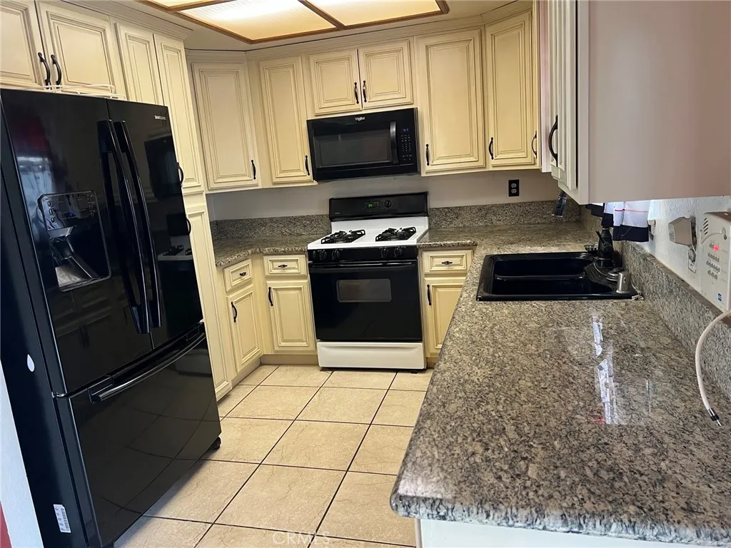 Discover this fantastic opportunity in Ontario, offering a blend of comfortable living and exciting potential. This home features a spacious, bright living area with vaulted ceilings, creating an open, airy atmosphere. The tile flooring throughout the main living spaces ensures easy maintenance. The well-appointed kitchen boasts ample cabinetry, granite-look countertops, and black appliances, including a refrigerator, microwave, and stove/oven. Its functional layout makes meal preparation a breeze. The home offers two bathrooms, one featuring a full shower/tub combo and a vanity, and another with a modern walk-in shower and a sleek black toilet. The bedrooms are ready for your customization, offering good natural light and the opportunity to create your ideal private retreats. Step outside to a generous backyard, perfect for outdoor entertainment, gardening, or simply relaxing in the California sunshine. The property includes a convenient utility shed for extra storage. Located in a desirable Ontario neighborhood, this home is a blank slate waiting for your vision to bring it to its full glory. Don't miss the chance to make this house your new home!