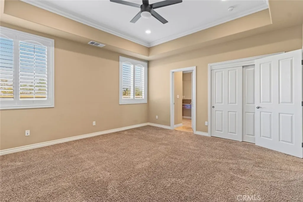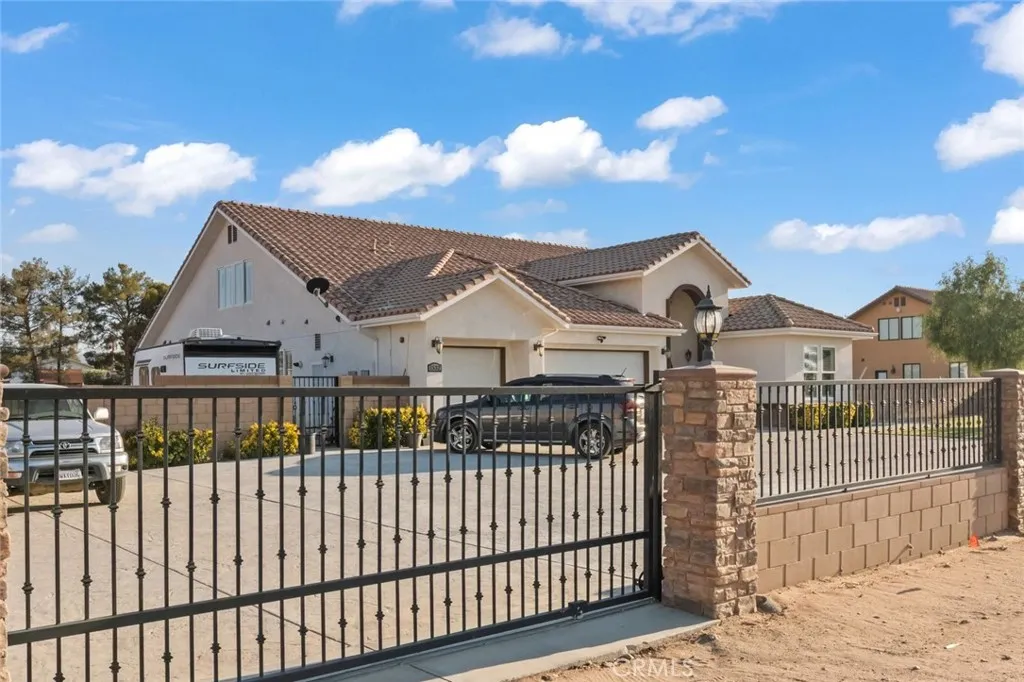 This magnificent 2-story custom luxury home, built in 2016, sits on a sprawling 1.12-acre lot in the highly sought-after West Palmdale area, just minutes from the Palmdale Mall, schools, dining, and freeway access, offering both convenience and privacy. Designed with exceptional craftsmanship and attention to detail, it features 4 spacious bedrooms, 4 full bathrooms, and an impressive loft with panoramic mountain views. Elegant upgrades include Venetian plaster walls, soaring high ceilings with crown moldings, custom travertine flooring, and abundant natural light throughout. The main-level master retreat offers French doors to the backyard, newer carpet, ceiling fan, a massive walk-in closet, and a spa-inspired bathroom with granite counters, double sinks, a soaking tub, and a glass-enclosed shower surrounded by luxurious stonework. Two additional downstairs bedrooms also feature high ceilings, custom molding, shutters, ceiling fans, and their own high-end full bathrooms. Upstairs, the open loft is perfect for a game room or lounge, alongside an additional bedroom with mirrored closet doors and another custom full bath. The gourmet kitchen boasts extensive custom cabinetry, granite countertops, and a seamless connection to the family room with built-in surround sound. Modern upgrades include a fully paid solar system, tankless water heater, custom security system, and premium finishes throughout. Outdoors, enjoy a 3-car garage, expansive cemented areas, two gated driveways, and iron gates for privacy, making this property ideal for both everyday living and grand entertaini