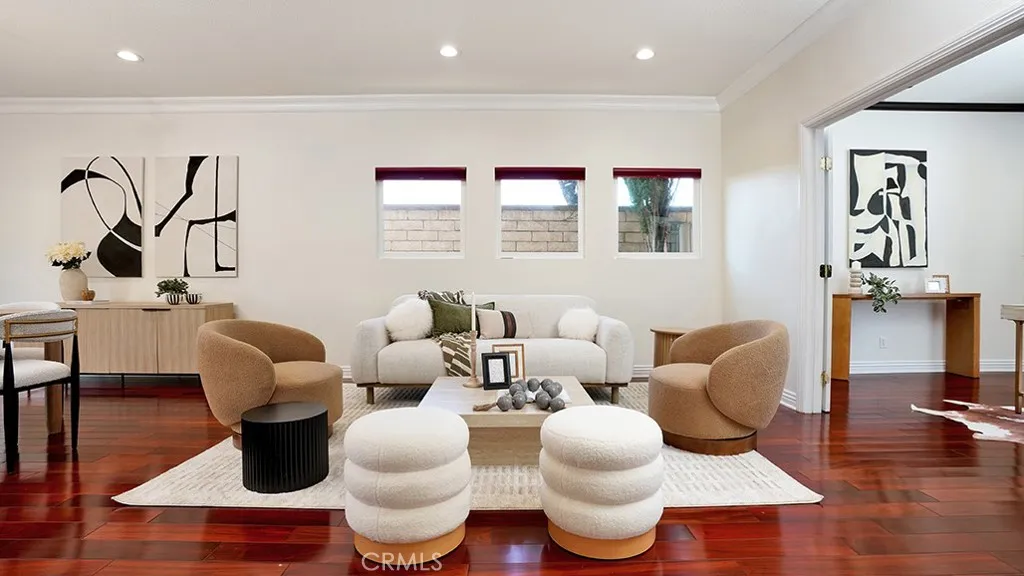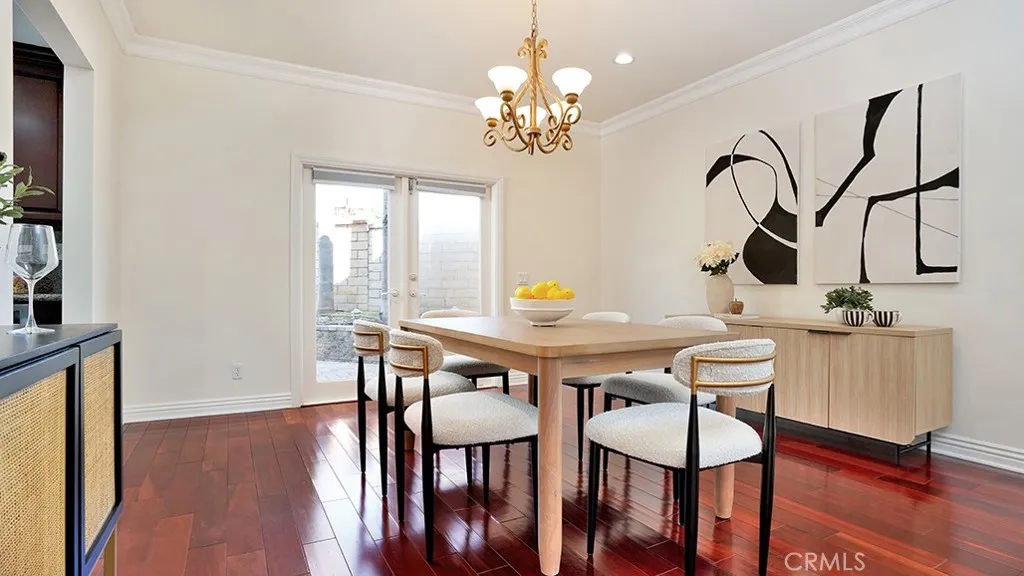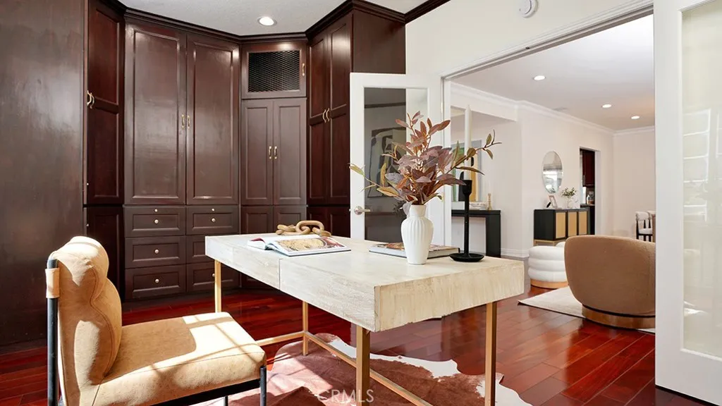 Nestled at the end of a quiet cul-de-sac in Northwood Courtside, 11 Burke is a beautifully kept 5 bed, 3 bath home filled with natural light and timeless charm. The versatile downstairs bedroom can be used as a private office or guest room, while Brazilian Rosewood floors and custom built-ins add warmth throughout. The open kitchen with stainless appliances, bar top counter, breakfast nook, and walk-in pantry flows to the cozy living room with fireplace and wood cabinetry. Formal dining and living areas open through French doors to a landscaped backyard with stonework. Upstairs features a spacious bonus room, three secondary bedrooms, primary suite with high ceilings, mirrored closets, walk-in shower, and jacuzzi tub. Additional highlights include an indoor laundry, direct 2-car garage access, and paid-off Tesla Solar Inverter. Residents enjoy low HOA, no Mello-Roos, pools, spas, tennis courts, picnic areas, parks and top Irvine schools: Brywood, Sierra Vista, and Northwood High. A true blend of comfort, style, and community!