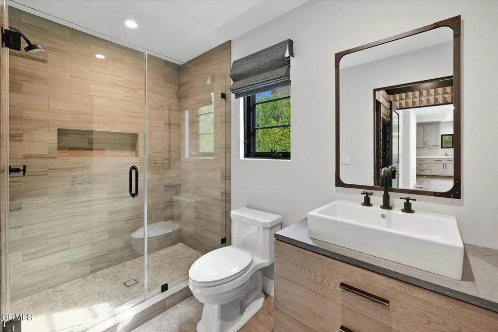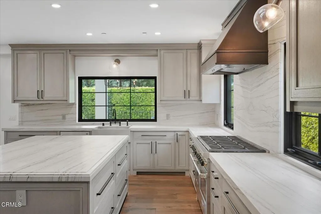 Experience luxury living in this exquisitely remodeled estate, featuring four bedrooms and six bathrooms, all meticulously maintained and ready for immediate occupancy. Completely updated in 2017, this residence seamlessly blends contemporary design with top-tier finishes, offering a unique living environment. The gourmet kitchen includes custom White Oak cabinetry and leather-finished Quartzite countertops and backsplashes. It also features a SubZero refrigerator and an expansive island with views overlooking the beautiful pool. Elevate your morning routine with a built-in Miele coffee machine. The home office is adorned with Philip Jeffries wood veneer wall coverings for an added touch of elegance.Enjoy the convenience of a newly installed water softening system and immerse yourself in entertainment with the Sonos sound system equipped with built-in speakers throughout the home. Relax in the saltwater PebbleTec pool and spa. The outdoor grilling station is outfitted with a Lynx stove, grill, sink, and refrigerator. A grand 330 square foot loggia/covered balcony, complete with a cozy fireplace and three Infratech heaters, ensures year-round comfort.The beautifully landscaped yards feature 10 olive trees and Bevolo gas lanterns at the entrance. The FX Luminaire low-voltage lighting system accentuates the stunning landscaping. Detached guest quarters, complete with their own bathroom, offer a perfect space for visitors or additional living quarters. The state-of-the-art security system includes nine HD cameras, a five-camera Ring system, and an alarm for your peace of mind.