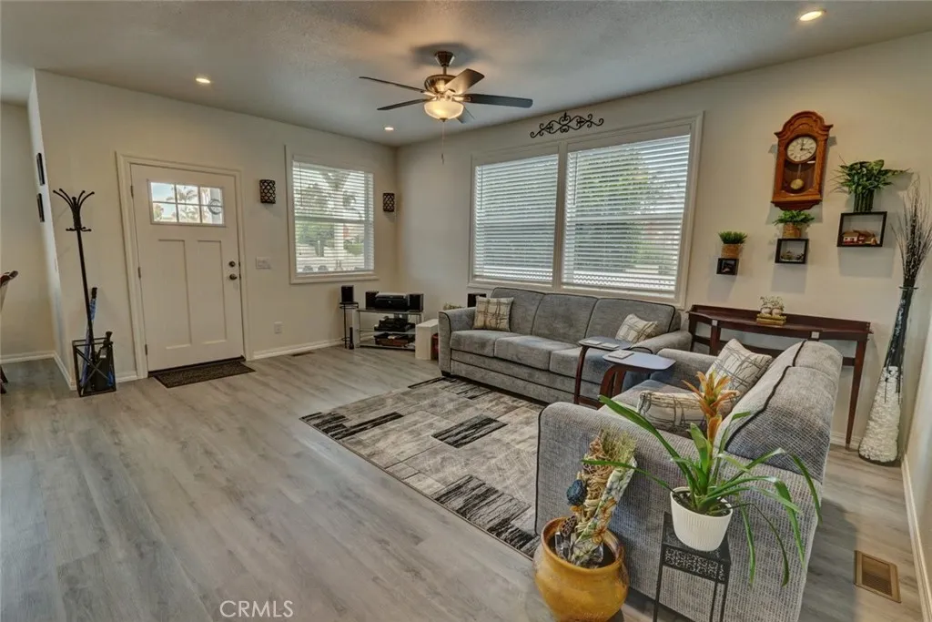 Fabulous Home in Bloomfield Mobilehome Park, a community for 55+! Featuring a Champion Skyline 2025 Year Model Home located in an area of the Community with 3 Homes on a Cul-de-Sac. Exceptional Open Floorplan with the Latest Trending Colors of Gray. Living Room, Kitchen and Dining completely open with a Large Island, fabulous Entertainment Living. Living Room overlooks the side yard and front porch, also featuring Recessed Lighting and a Ceiling Fan. Kitchen features Stainless Steel Appliances, Lots of Cabinetry and an Island with more Cabinetry and Pendant Lighting. Master Bedroom has a Walk-In Closet, Ceiling Fan and adjacent is the Master Bath with a Walk-In Shower, Glass Doors, Dual Sink Vanity, Double Closet and Private Toilet. Guest Bedroom features a Double Closet and Ceiling Fan, Den featuring a Ceiling Fan as well. Many windows with Blinds and Laminate Flooring throughout. Laundry Room leads to the Carport Area containing a Large Shed. This Home features a Back and Side yard with a Gate for Privacy. Make this your dream Oasis, graded and ready for your ideas. Amazingly private and secluded area of Cypress. Definitely a Must See!