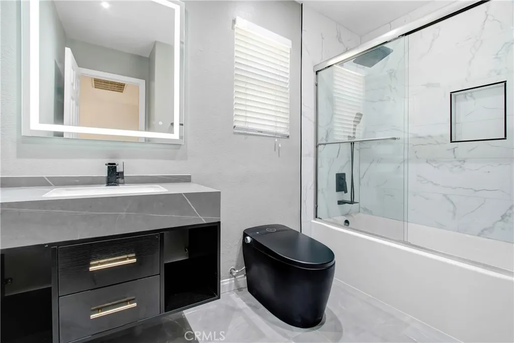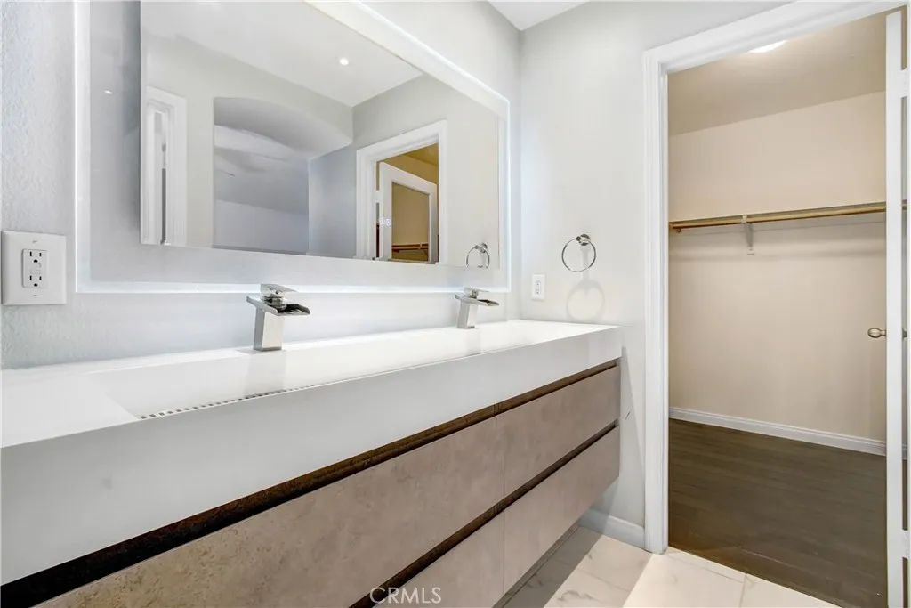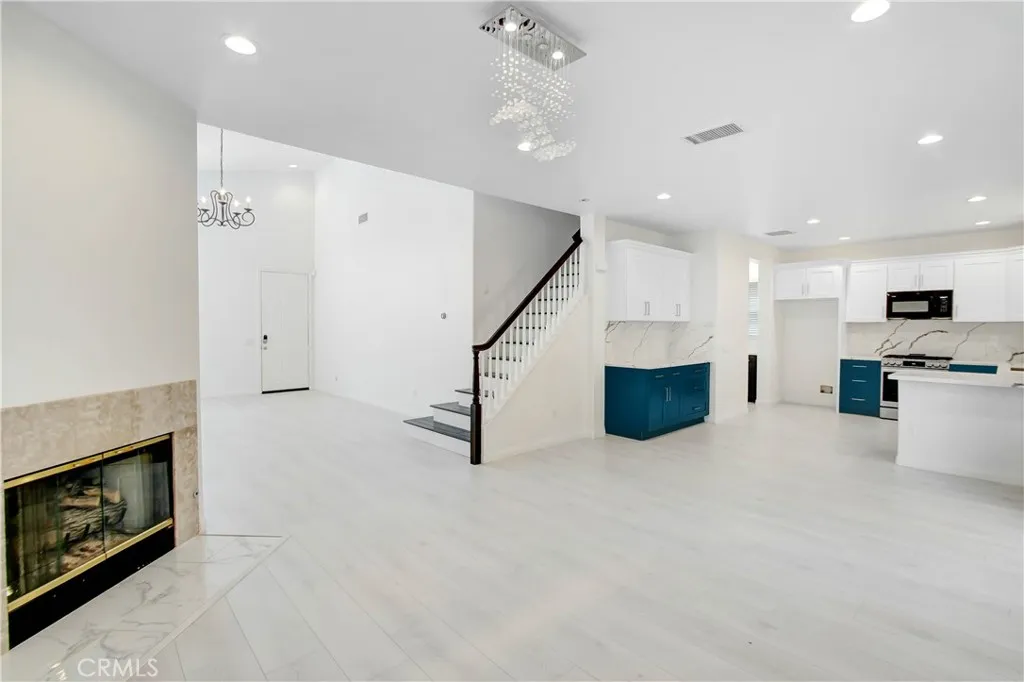 Welcome to an exceptional opportunity in Santa Clarita! This beautiful residence, boasting 3 bedrooms and 2.5 bathrooms, offers ample space for comfortable living. As you step inside, recessed lighting throughout creates a warm and inviting ambiance, complementing the airy kitchena chef's dream with its blue and white shaker cabinets, quartz countertops, and backsplash. Equipped with stainless steel appliances, including a farm sink and gas range, the kitchen seamlessly blends style with functionality. But there's more to love about this home. The main floor features a modern half bath with a floating vanity, enhanced by sleek OLED mirrors. Nest central air and heat ensure year-round comfort, while the newly painted interior adds a fresh touch to the home's aesthetic. Upstairs, the primary bedroom retreat awaits, complete with a ceiling fan, walk-in closet, and a beautifully tiled en-suite bathroom featuring a dual sink modern vanity and multi-jet shower system. Convenience is elevated with upstairs laundry, making chores a breeze. Additionally, a home office nook provides the perfect space for productivity or relaxation. Throughout the upstairs, elegant cherry wood flooring graces the hallways and bedrooms, adding warmth and character to every space. Artificial turf in both the front and back yard to enjoy a lush, green landscape year-round with minimal maintenance. Embrace the essence of modern living and make this exquisite residence your new home sweet home.