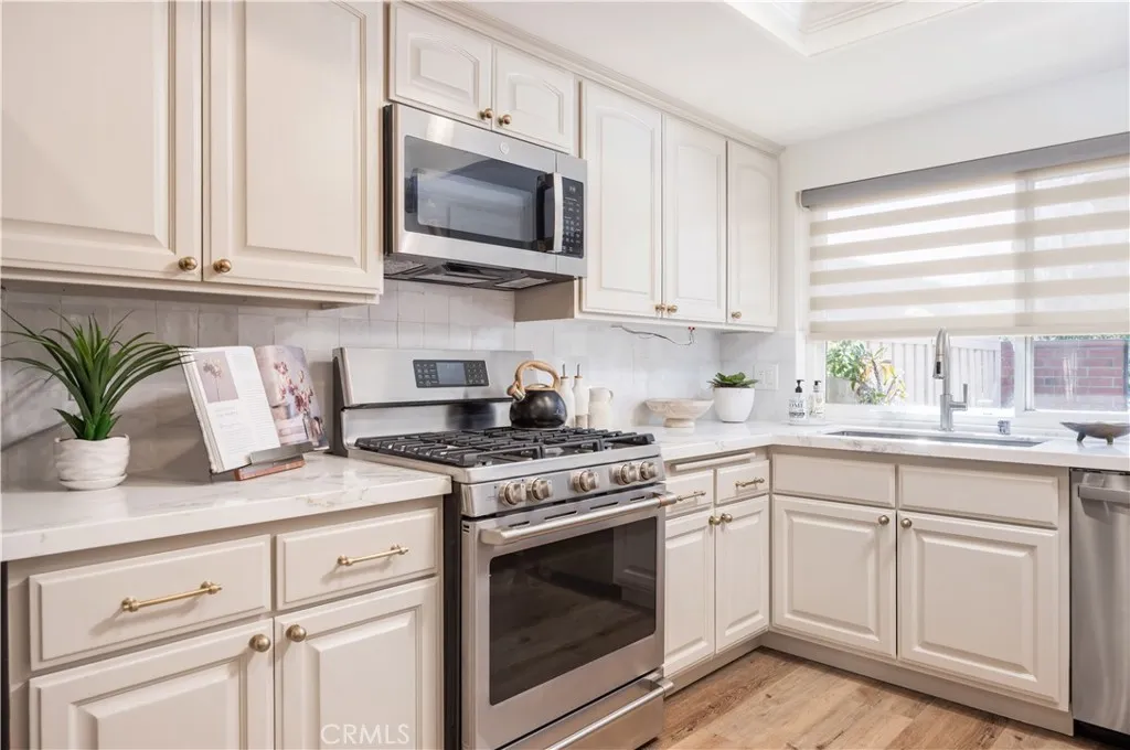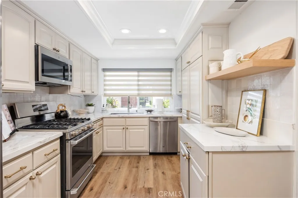 Welcome to 17292 Candleberry Where Modern Comfort Meets Timeless Serenity. Step into this beautifully upgraded home in the highly desirable Terrace community, where every detail is thoughtfully designed for a perfect blend of style, function, and warmth. From the moment you enter through the charming private courtyard, youll feel an immediate sense of homea peaceful retreat surrounded by greenery and open space.Inside, a bright open floor plan welcomes you. The once-enclosed kitchen was reimagined to create seamless flow between the kitchen, dining, and living areas. The living room features vaulted ceilings, abundant natural light, and direct access to the private backyardideal for both relaxation and entertaining. Open the patio door on cool evenings to enjoy a natural indoor-outdoor ambiance perfect for gatherings or quiet nights in.The kitchen shines with new upgrades, including laminate flooring, modern countertops, refreshed cabinetry, stainless steel appliances, and a designer backsplash. The primary suite offers a peaceful retreat with new flooring, a walk-in wardrobe, and an updated bath. The second bedroom is equally inviting with fresh paint, new flooring, and a nearby full bath.Adding tremendous value is the spacious loft, offering about 160 sq. ft. of flexible living spaceperfect as a home office, guest area, or easily convertible into a third bedroom + bath. If youre shopping for a 3-bedroom home nearby, youll see what an exceptional opportunity this is.Beyond your private yard, a gate opens directly onto the lush greenbelt, ideal for walks, yoga, or playtime
