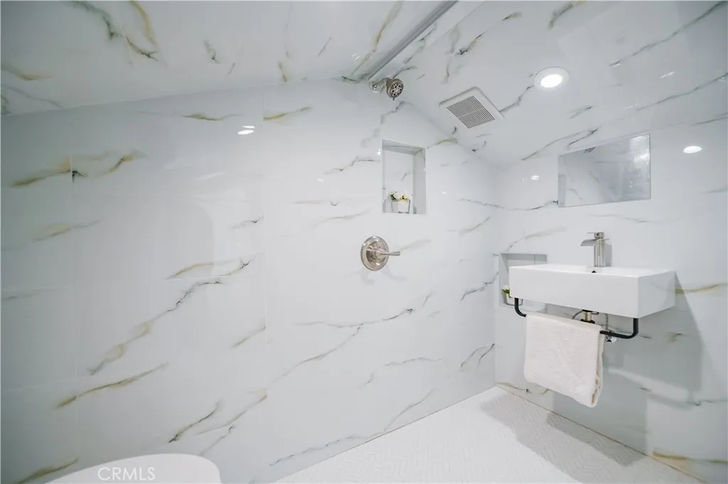 Furnished. Remodeled. 2 bedrooms,2 bathrooms downstairs and 1 bedroom +1 bathroom upstairs. This beautifully remodeled home has been meticulously maintained .Partially new flooring.Dual pane windows and patio slider. The renovated bathrooms are spectacular with custom mosaic tile, natural stone and glass countertops. The master suite features a walk-in closet with custom organizers, ceiling fan and wainscoting. The kitchen opens to the Great Room with fireplace, wet bar, soaring ceilings and an abundance of natural light from multiple sources. The entry courtyard and fenced rear yard are both private and secure. 2 car garage with private driveway, total 4 car parking spaces. The part of ceiling on hallway upstairs is low. The schools are among the best in California and shopping, dining and freeway access is nearby. The association has 2 resort style pools, spas, lighted greenbelt, BBQ and clubhouse.Close to a coming soon supermarket.