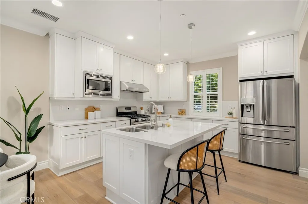 Welcome to 56 Strawberry Grove, a detached residence in the highly desirable Cypress Village community of Irvine. This beautifully maintained 3-bedroom, 2.5-bath home offers approximately 1,567 sq. ft. of light-filled living space designed for comfort and modern functionality. The main level features an open-concept layout with a spacious great room, dining area, and contemporary kitchen showcasing white cabinetry, quartz countertops, stainless-steel appliances, and a large center islandideal for both everyday living and entertaining. Upstairs, the primary suite includes a walk-in closet and dual-sink vanity. Two additional bedrooms share a full bath, and a versatile built-in desk nook with upper cabinets provides the perfect workspace or study area. A full laundry room and thoughtful storage complete the second level. Residents of Cypress Village enjoy access to resort-style amenities including pools, parks, playgrounds, sports courts, and scenic trails. The neighborhood is served by top-rated Irvine Unified schoolsCypress Village Elementary, Jeffrey Trail Middle, and Irvine Highrecognized for academic excellence and community engagement. Conveniently located near shopping, dining, and major freeways, this detached home combines modern design, functional living, and the exceptional lifestyle that defines Cypress Village Irvine.