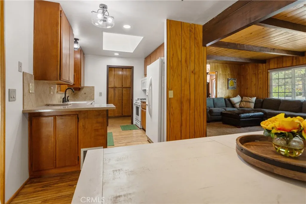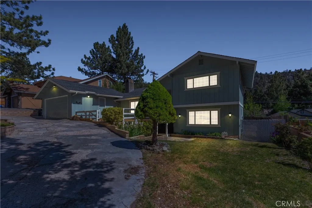 Welcome to the serene community of Wrightwood, where this beautiful home at 784 Apple Ave awaits you. Spanning 2,162 sq ft, this residence features 3 spacious bedrooms and 2 bathrooms, ideal for comfortable living. As you enter, you are greeted by an inviting living room with wood beamed ceilings that create cabin atmosphere in the home. The cozy fireplace serves as a central focal point, radiating warmth throughout the main living areas. Adjacent to the living room, you'll find an open dining area and family room, perfect for family gatherings. The kitchen is equipped with complete appliances, including, dishwasher, oven, range and refrigerator. The home's thoughtful layout includes two bedrooms located a few stairs up on the upper level, complemented by a shared full bath, creating a private retreat for family or guests. The downstairs area boasts easy access to the backyard and includes a spacious bedroom suite, offering privacy and comfort. Step outside to discover a fully fenced backyard with beautiful landscaping, mature trees including an apple tree. An extra-large storage shed, providing both beauty and functionality. Dual Pane windows throughout the home for energy efficient summers and winters. Central AC and Heat with additional heat source with the fireplace wood burning insert. New roof installed and septic tank installed 2022. This property features a detached 2-car garage, accessible from the front deck or backyard, with a convenient U-shaped driveway for hassle-free parking. In garage EV Charger for electric or hybrid vehicles. Situated just minutes from dow