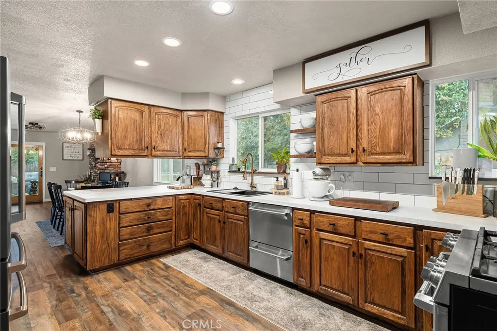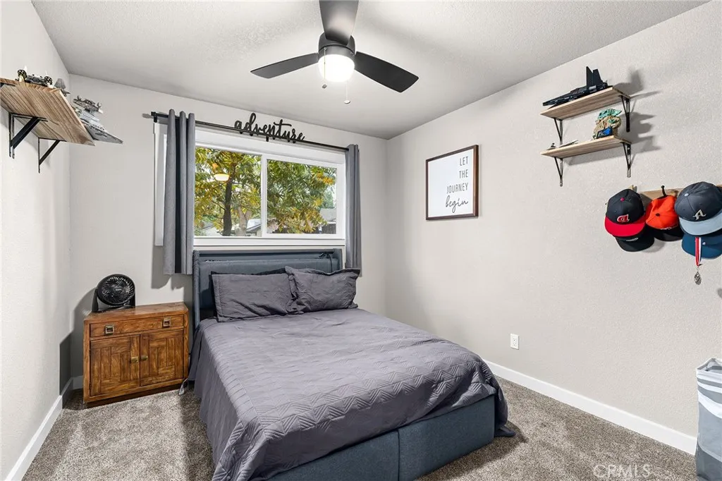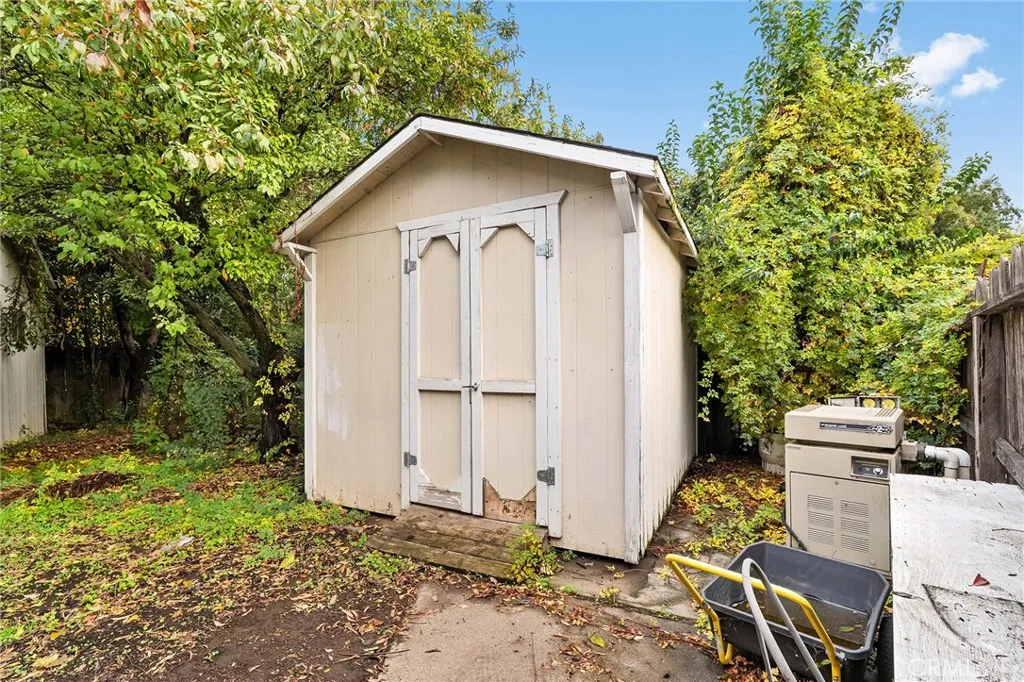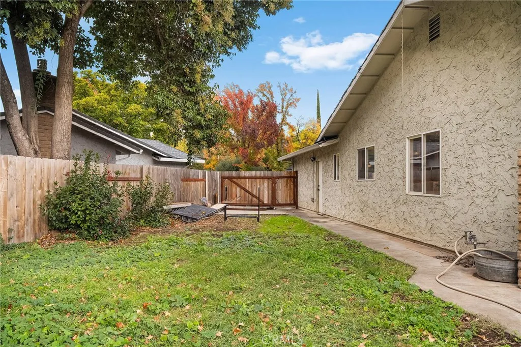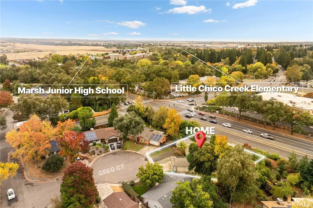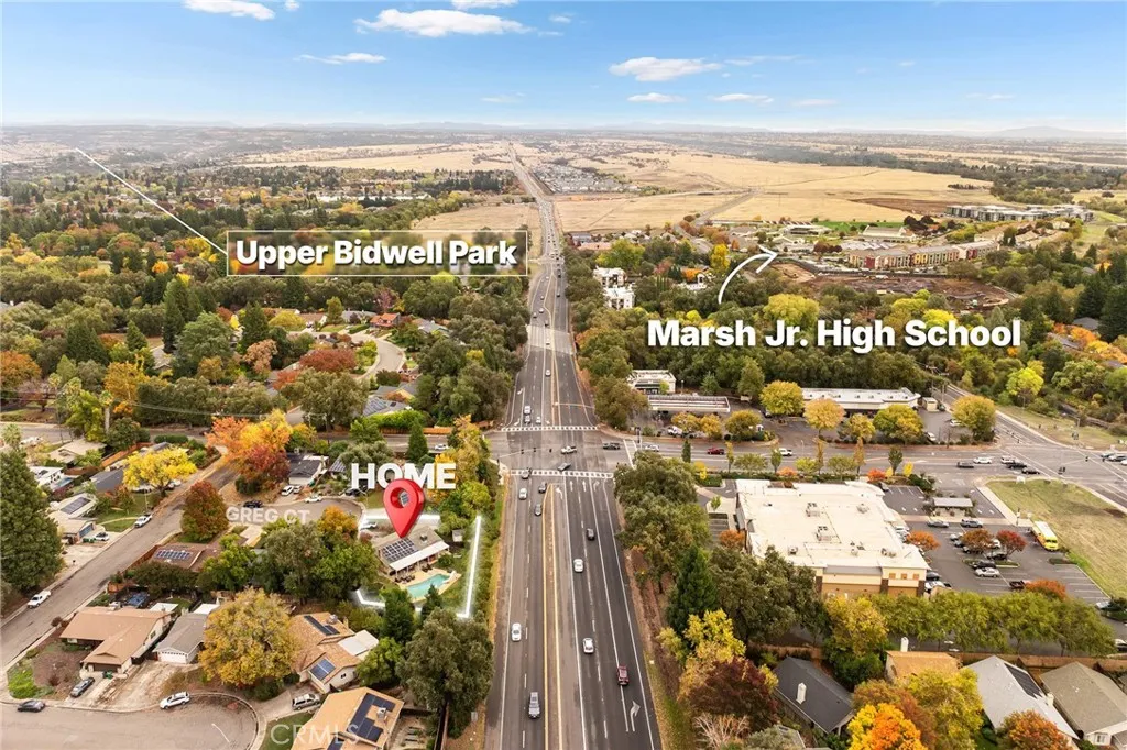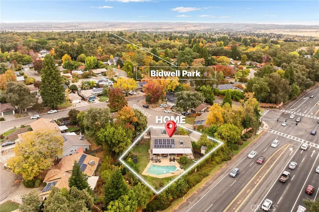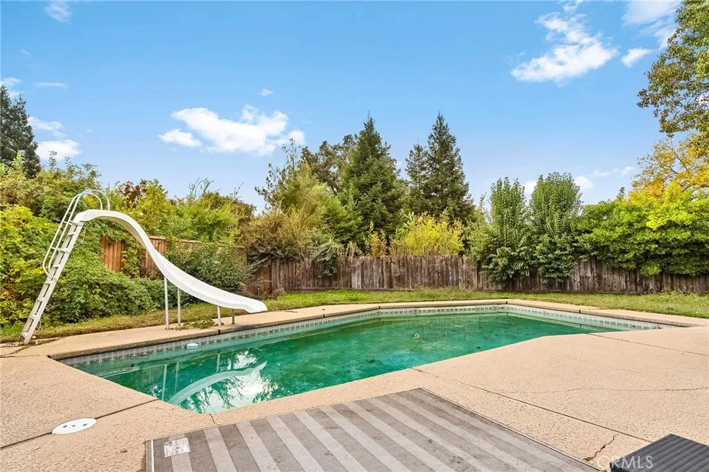 Nestled on a cul-de-sac just blocks from Lower Bidwell Park, this beautifully updated 4-bedroom, 3-bath home with an office offers the perfect blend of comfort, functionality, and charm. Over the past few years, nearly every surface has been refreshed from new drywall, texture, and paint throughout to all-new lighting, fixtures, and appliances. Step inside to an inviting, well-designed floor plan with the bedrooms privately situated on one side and the main living spaces on the other. The spacious living room features warm laminate flooring, a classic brick fireplace, and abundant natural light with easy access to the backyard. The kitchen offers generous counter space, new appliances, and a large granite single-basin sink. The bathrooms have been stylishly updated with new tile and double sinks in both the hall and main bathroom, while three of the four bedrooms feature new plush carpet. Behind the scenes, the home has received major system upgrades including a new HVAC system, tankless water heater, added insulation, and solar panels with a new inverter for energy efficiency. The backyard is an outdoor retreat complete with a large covered patio, mature fruit trees, a spacious lawn, and an in-ground pool with a slide for summer fun. A detached secondary garage with a roll-up door makes an ideal workshop, complemented by an additional storage shed. Located just minutes from Chicos parks, trails, schools freeway access, and downtown, this move-in ready home truly checks all the boxes!