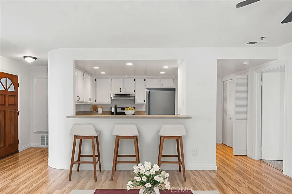 Upgraded 1 bedroom, 1 bath condo in the highly desirable Coral Pointe community of Costa Mesa. Spacious living room includes a fireplace and an abundance of natural light from the large slider leading to your private front patio. The kitchen features quartz countertops, recessed lighting and stainless steel appliances which include a brand new refrigerator. This unit has a freshly painted interior and wood laminate flooring throughout the common areas. The oversized bedroom has brand new carpet and features a walk in closet and private back balcony. Large upgraded bathroom with quartz countertops and tile flooring. Indoor, private laundry off the kitchen. The community features gated underground parking which includes two spots for this unit, a large dog/park area in the back and guest parking out front. The exterior and common area of this community has gone through significant renovations recently. Water is paid by the association. Conveniently located near major freeways, shopping, dining, entertainment and is less than 4 miles from the Pacific Ocean. This home is truly turnkey.