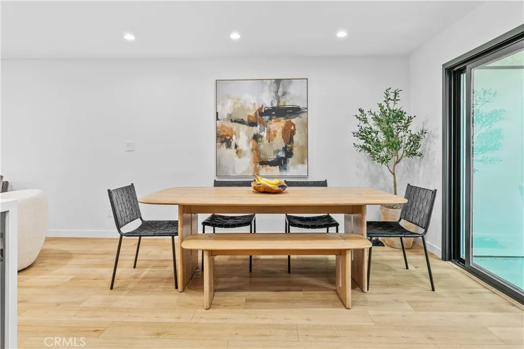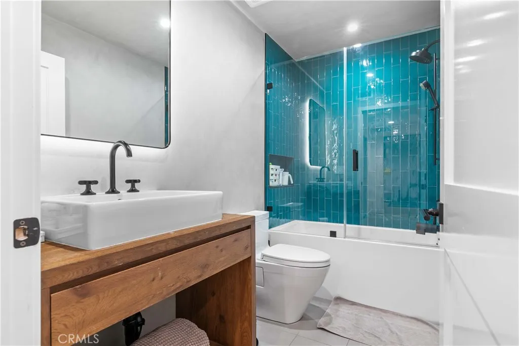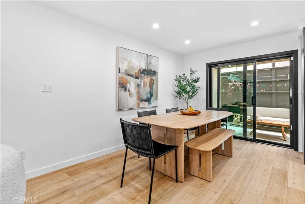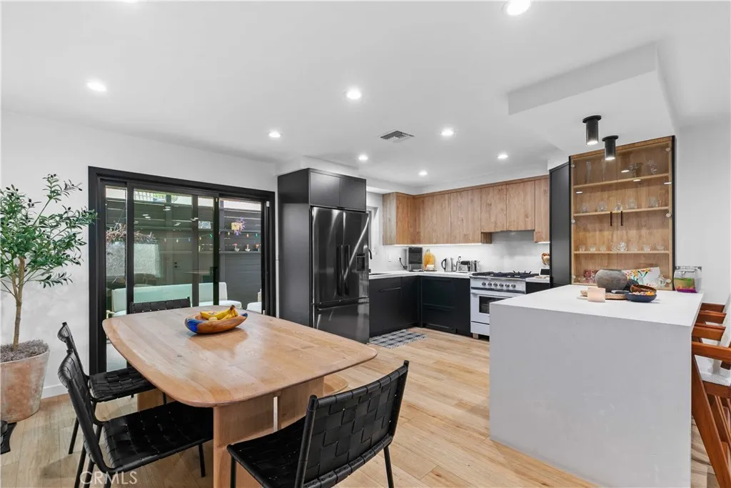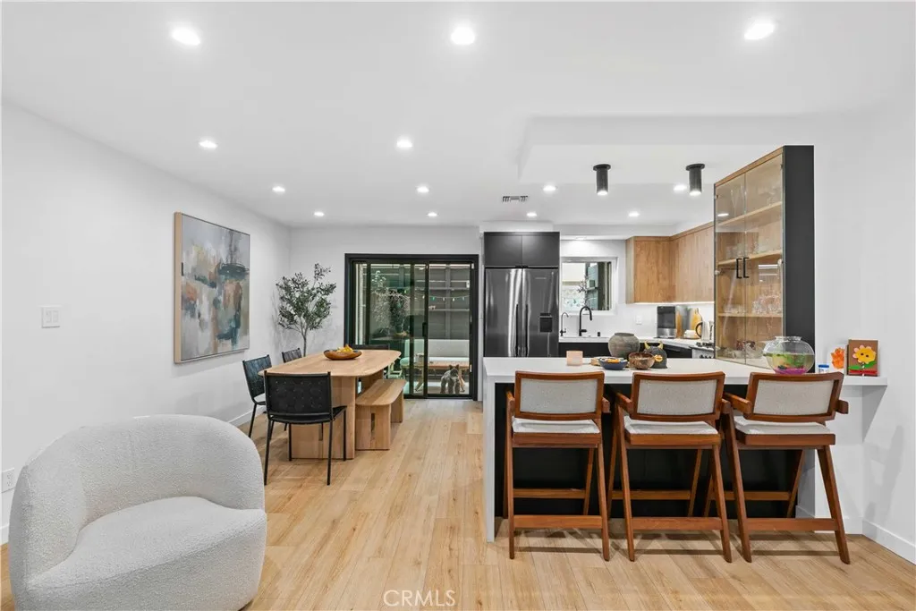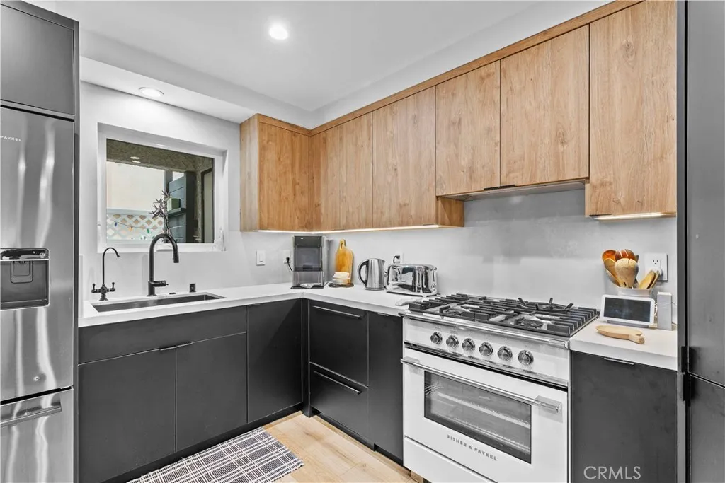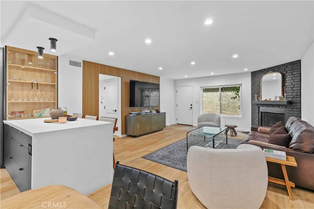 Discover elevated Burbank living in this fully remodeled, single-level condo offering 1,231 sq ft of curated design and effortless comfort. Every detail has been thoughtfully reimagined with premium finishes and a clean, modern aesthetic. An open floor plan anchors the home, highlighted by smooth-coat walls + ceilings, updated windows, wide-plank flooring, and recessed lighting. The living room centers around a striking black brick fireplace and custom wood-slat media wall (TVs included). Large sliding doors blur the line between indoors and out, opening to an oversized covered patioyour new lounge, dining deck, and year-round hangout. The patio/side yard adds extra space for grilling, dinning and storage. The grilling station and dedicated lighting will be included. The kitchen delivers style and function with a full Fisher & Paykel appliance suite (gas range/oven, French-door refrigerator, dishwasher), matte black cabinetry, warm wood uppers, quartz surfaces, under-cabinet lighting, a glass-front display cabinet, and peninsula seating. Both bedrooms feel calm and intentional, offering generous closets, custom shelving, and a built-in vanity desk. One bathroom features a Restoration Hardware sink, while both are finished with designer tile, Brizo fixtures, and modern detailing. The dedicated laundry room adds convenience with built-ins and a glass-door entry. Smart upgrades include an alarm system, central HVAC, and secured garage parking with two assigned spaces + dedicated Tesla/EV charging. Private storage cabinets are located above the parking. Situated in a convenient