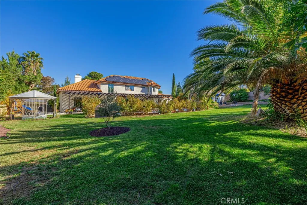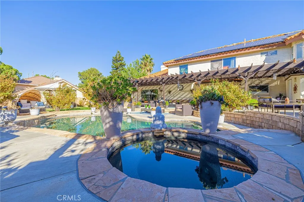 Welcome to a residence where elegance, efficiency, and entertainment unite in one stunning property. Nestled in the prestigious West Palmdale/Quartz Hill area, this luxury estate offers 4 bedrooms, 3 full baths, and 3,218 sq. ft. of refined living space, plus an additional 200 sq. ft. office/flex room not included in the total. Office upstairs can double as 5th bedroom(by adding a closet), provides versatile options for work or leisure. Set on a beautifully landscaped 21,212 sq. ft. lot, this home is designed for resort-style living. Enjoy a Pebble Tec pool and spa, 8-person sauna, covered patio, and multiple outdoor spaces for dining, games, and relaxation under breathtaking sunsets. 46 owned solar panels with two backup batteries, Tesla app integration, and a smart thermostat system for HVAC and irrigation ensure modern energy efficiency and comfort. Through elegant double doors, you're greeted by a grand staircase, chandelier, and bright open floor plan. The formal living (with sliding doors to the backyard) and dining rooms, feature engineered plank flooring, and exquisite architectural details throughout. A downstairs guest suite with nearby full bath offers privacy and flexibility. The primary retreat features a cozy fireplace in the blt-in cabinet (which stays), spa-inspired bath with soaking tub, separate shower, and dual sinks. Upstairs includes additional bedrooms plus a flex space perfect for an office or studio. The gourmet kitchen includes newer stainless appliances (refrigerator incl.), and the laundry room with built-in desk comes with washer and dryer. A two
