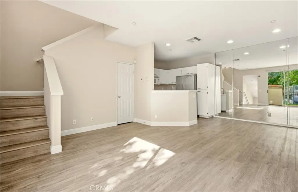 This stunning 1 Bedroom/1.5 Bath Townhome with Direct Access 2-car Garage is in perfect interior tract location overlooking a large grassy greenbelt with easy access to guest parking! Beautiful upgrades include wide plank laminate hardwood flooring throughout (no carpet!!) NEW bright neutral paint, NEW fixtures, beautiful and extended height baseboards! Spacious master suite has a dual sink vanity and walk-in closet! Upgraded stainless steel refrigerator, washer and dryer are included! Enjoy the near by resort style amenities, including a private gym, swimming pools, spas, sports court, and tennis courts!