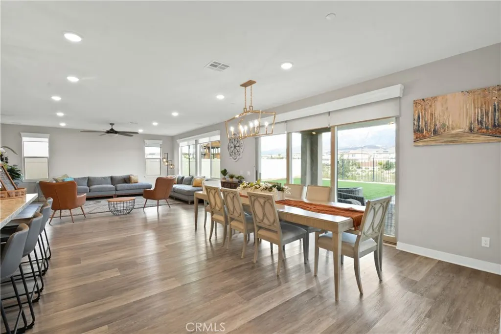 This beautiful single-family home offers the perfect blend of comfort, style, and convenience. This is the largest floor plan home called Horizon at Atwell Community. Featuring spacious rooms, modern amenities and a welcoming atmosphere. Flooring with luxury vinyl throughout main floors, hallways & stairways with upgraded handrails and light fixtures. Living space-open-concept living and dining areas with plenty of natural light, and recessed lights, then to Formal Dining area, special folding sliding doors when you party you can entertain open it with extended to outside covered patio. Remote control shades at sliding doors. Next to it modern Kitchen, with large center island with quartz finished countertop, equipped with stainless steel appliances. Then the White Kitchen Cabinets with light fixtures inside the upper portion. Walk in Pantry plenty of room. Then next to it bathroom and one bedroom for guest. Walk upstairs where you will find the spacious primary bedroom, separate bathrooms, walk in closet for all your collection. Then to Loft Area/Family Room, another place for TV Theater or just listening to your favorite music. Landscaped backyard with a patio, perfect for entertaining or relaxing with low maintenance artificial turf, with paver stones on the sides with wrought iron fence directly behind the house with unobstructed views of the mountain, community lake, walking trials. Another covered patio on the side. You are few steps to the community pool with spa, BBQ area and parks. Hiking trails and biking trails. There's Solar Panels on the house which is package