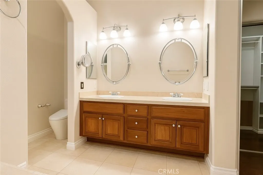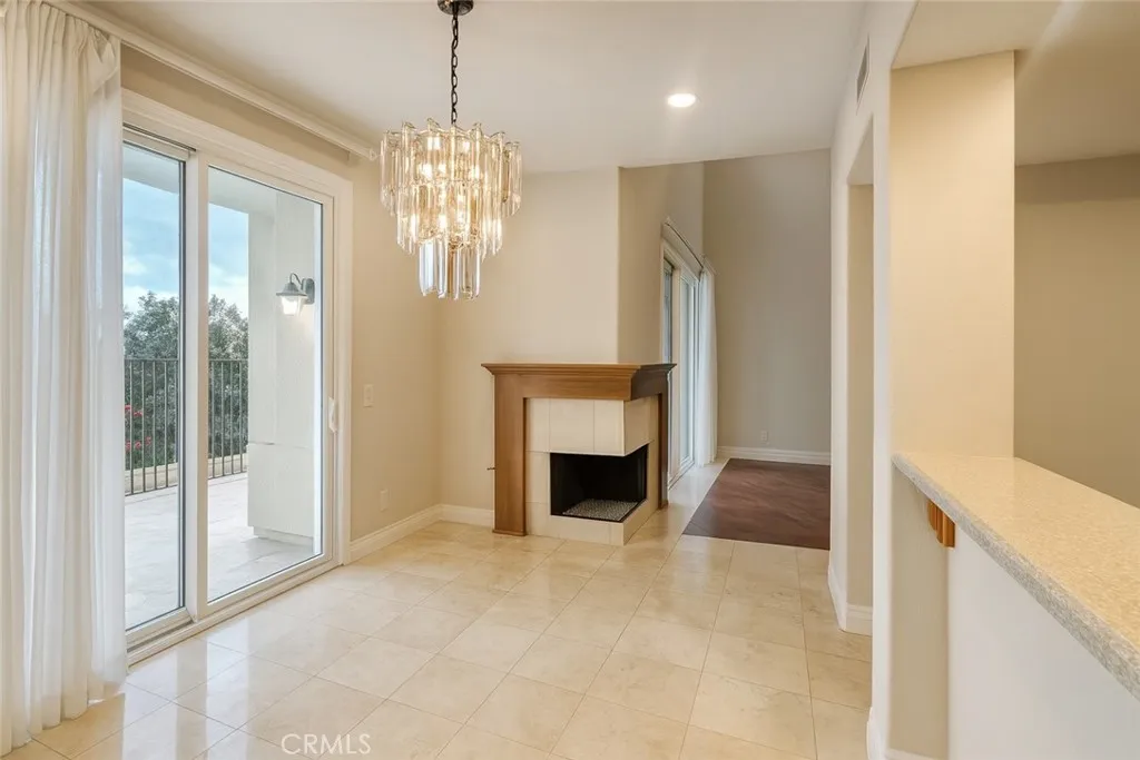 Welcome to this beautifully maintained California Renaissance home offering three bedrooms, three bathrooms, a two car attached garage, and approximately 1640 square feet of light filled living space with truly sweeping panoramic views. Step inside to an inviting entry that immediately feels bright and open. Just off the entry is a versatile enclosed den that works perfectly as a home office, guest room, or third bedroom. A full downstairs bathroom sits nearby and features an updated vanity and a walk in shower with a clean frameless glass enclosure. The main living room opens beautifully as you move further in, with soaring two story ceilings and walls of windows that bring in natural light throughout the day. The dual sided fireplace anchors the space and adds warmth and character. Around the corner is the kitchen which has rich cherry cabinetry, KitchenAid black stainless appliances, and a recently updated refrigerator. The kitchen flows easily into the dining room which enjoys views of the surrounding hills. Sliding doors lead to the covered patio and outdoor area which offer stone hardscape, mature landscaping, and beautiful open space behind the home. This is a wonderful spot for morning coffee or evening gatherings. Also on the main level is a separate laundry room with washer and dryer included and built in cabinetry. Upstairs you will find an airy loft that is ideal for an additional work area or a quiet reading space. The ensuite second bedroom has its own full bathroom and a walk in closet with built in organizers. The primary suite sits at the back of the home a