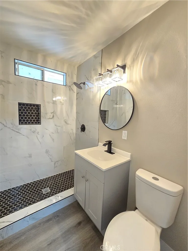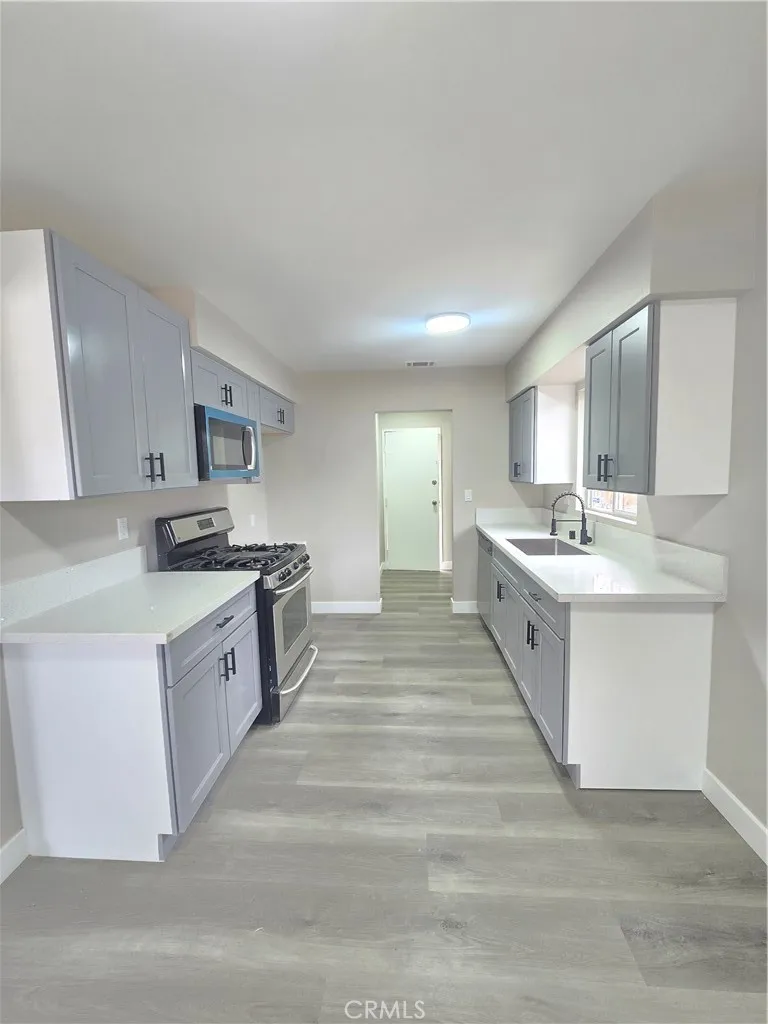 Beautifully remodeled single-family residence offering 3 bedrooms, 2 bathrooms, and 1,044 sq ft of modern living space. This home has been fully updated throughout with contemporary finishes, new flooring, fresh interior paint, and upgraded fixtures. The open and bright layout creates a warm and inviting atmosphere from the moment you step inside. The stunning, newly remodeled kitchen features gray shaker cabinetry, quartz countertops, stainless steel appliances including a microwave, gas range, and dishwasher, plus a deep stainless sink with a modern pull-down faucet. The adjacent indoor laundry room provides convenient washer/dryer hookups and additional overhead storage. Both bathrooms have been tastefully renovated with sleek vanities, matte-black fixtures, rainfall showerheads, large-format marble-style tile, and decorative black hex tile shower floors and niches. Additional highlights include central heating and air conditioning (HVAC), updated lighting, and luxury vinyl plank flooring throughout. Please Note: The garage has been converted into an ADU and is not included with this rental.