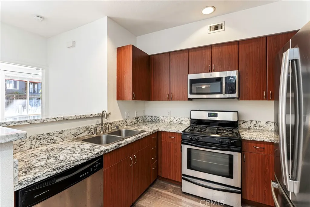 Resort-style living at its finest in the Stadium Lofts of Anaheim! This unit offers 2 bedrooms, 2 bathrooms, a walk-in closet, and 2 covered parking spaces. Step into a bright, open floor plan with brand-new laminate flooring, tall ceilings, central AC and heat, a tankless water heater, full-size indoor laundry, and stainless steel appliances. Conveniently located steps from the parking structure, perfect for grocery runs, and overlooking the pool. The Stadium Lofts community features a clubhouse with kitchen and pool table, meeting room, resort-style pool and spa, remodeled fitness center, sauna, indoor lounge with TV, outdoor lounge with fireplace, and multiple BBQ courtyards. Prime location just steps to Angel Stadium and ARTIC, NEW OC VIBE and close to The Grove, Disneyland, Honda Center, great dining, and the 5 & 57 freeways.