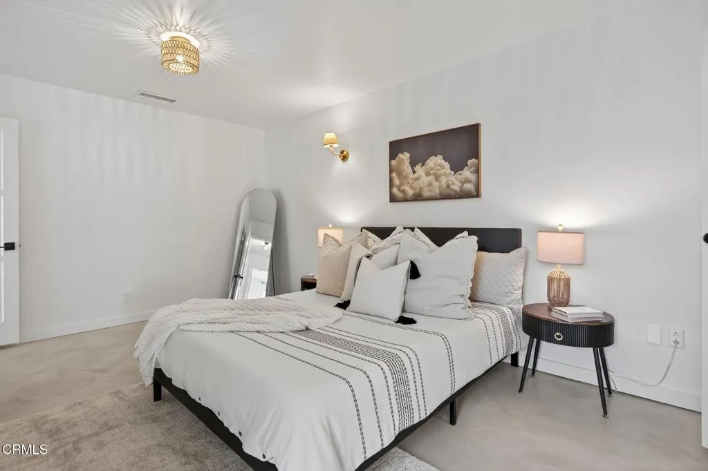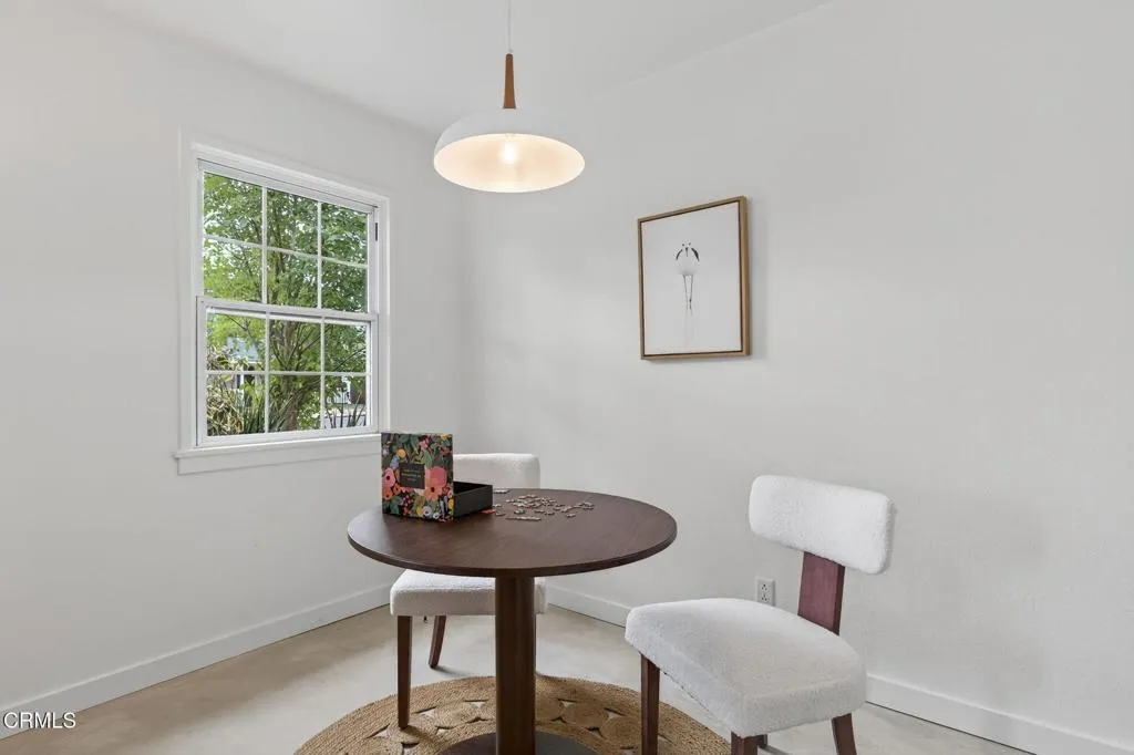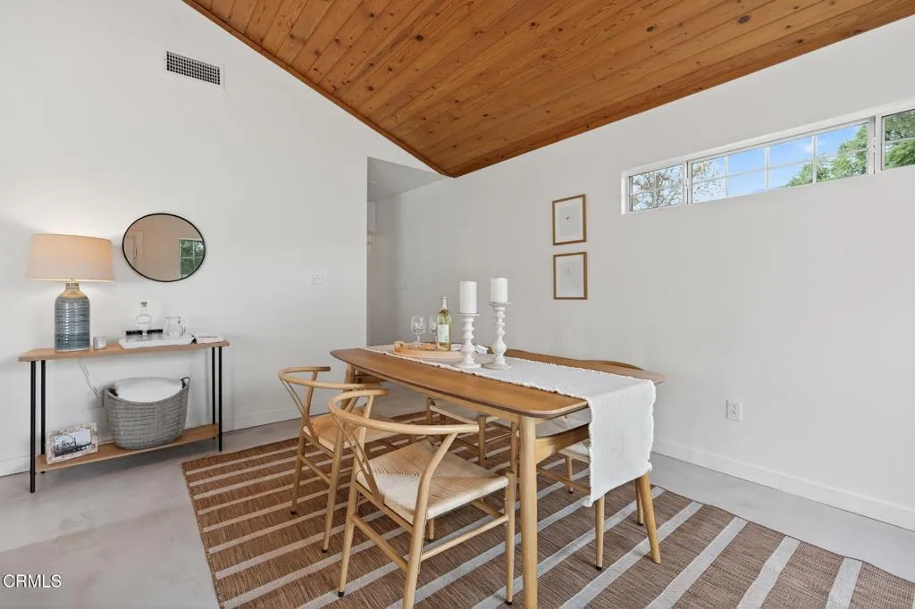 Wonderful downtown Ojai home with cool concrete floors, Silestone countertops, remodeled baths and vaulted ceilings. This fresh property has both a living room and spacious great room for dining, entertaining or just hanging out. The kitchen, with custom cabinets, open shelving and a built-in pantry is super functional. The primary bedroom is delightfully roomy with a walk-in closet. Owned solar panels keep the electric bills low and a separate laundry area inside the house is always welcome. The detached two car garage could be made into an ADU and low maintenance landscaping with available gardening boxes could inspire your inner gardener. Walk or bike to the best dining, movies, Farmer's Market and all Ojai has to offer. Come home for the holidays!