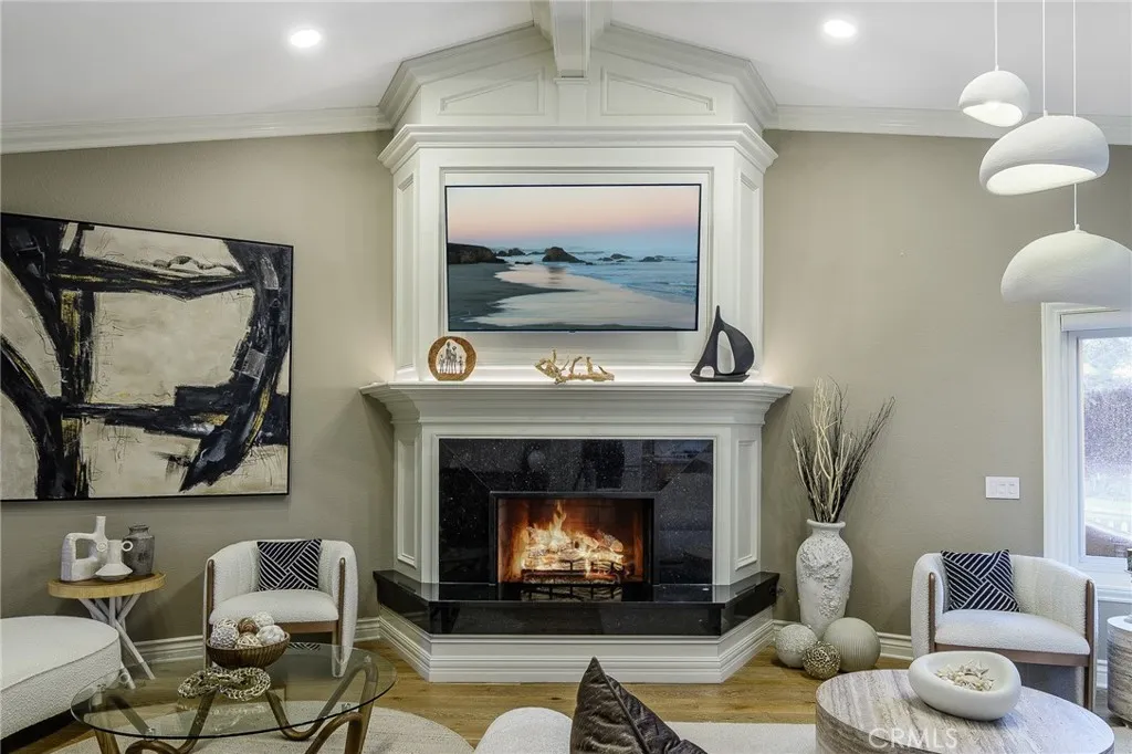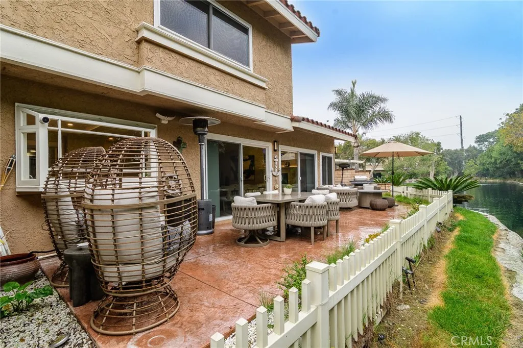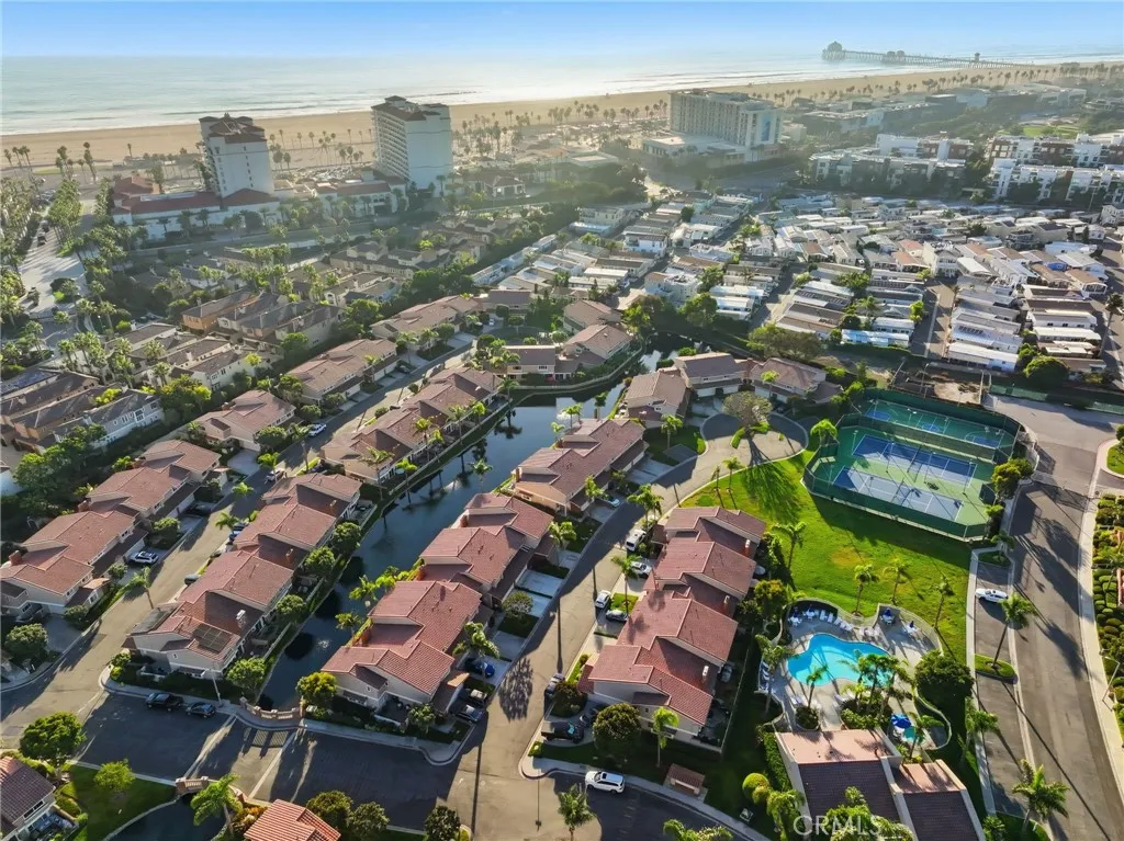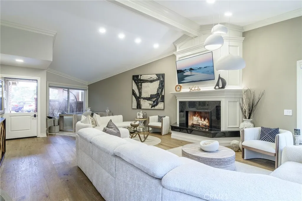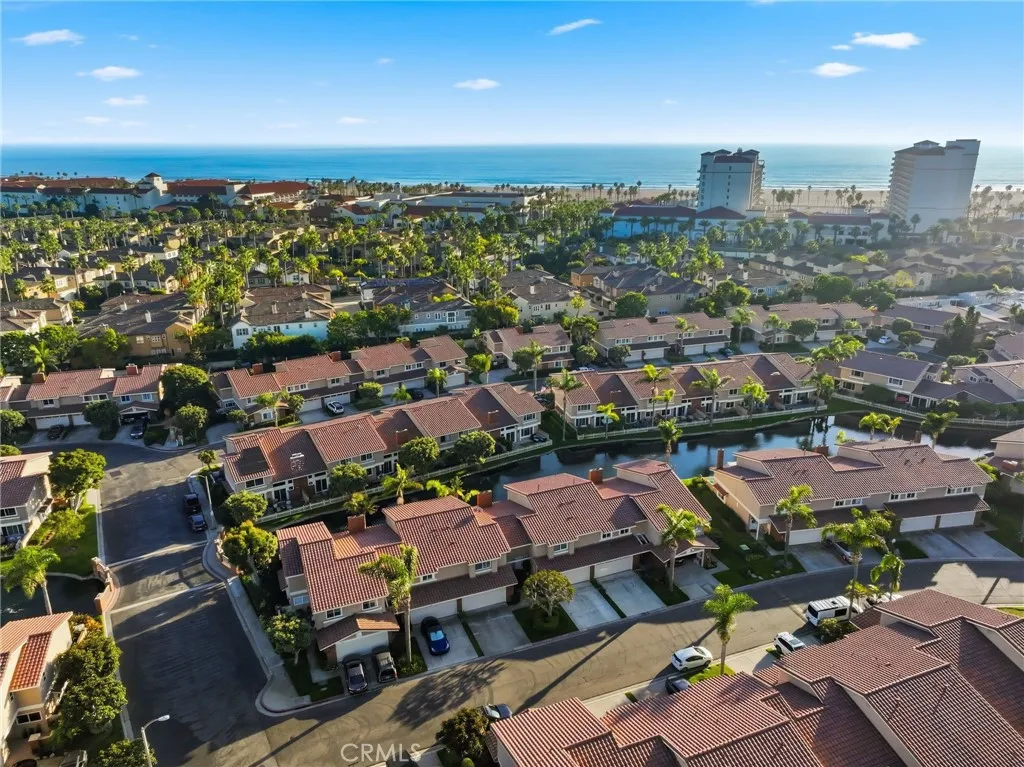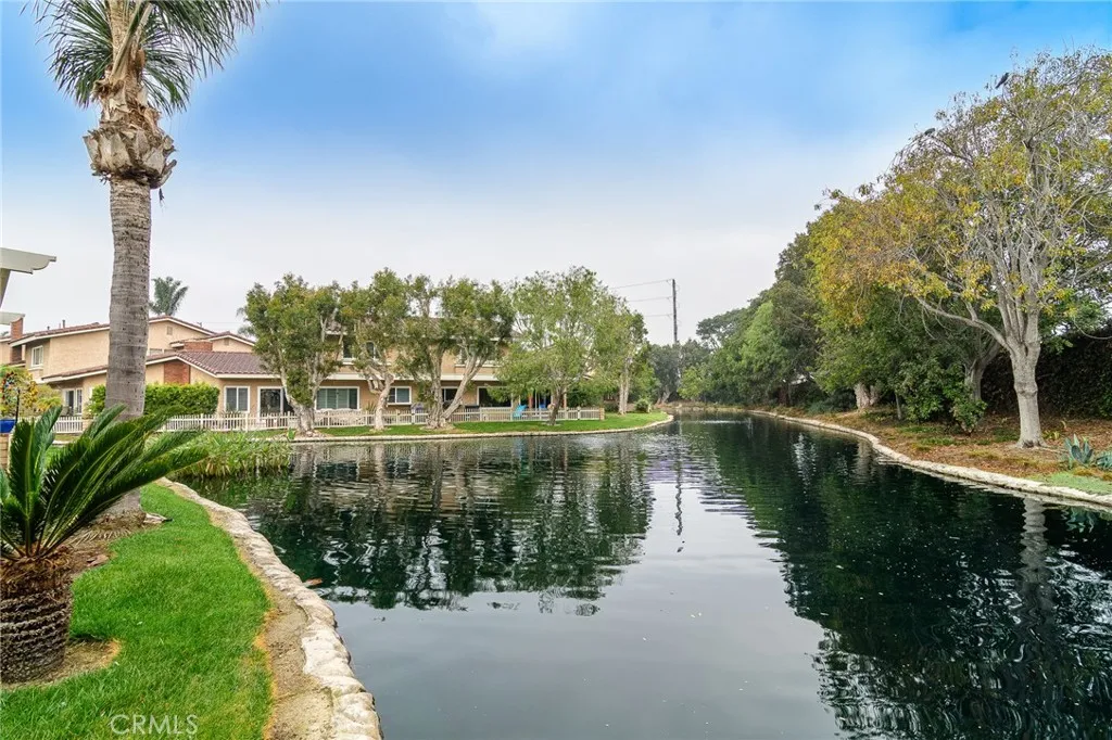 Experience coastal living at its finest in this beautifully fully remodeled, custom-designed townhome just steps from the beach, Pacific City, downtown Huntington Beach, parks, shopping, and dining. Located within the highly sought-after gated community of Seaside Village, residents enjoy access to a community pool/spa, tennis and sport courts, community event hall, and serene waterways. This two-story, 3-bedroom, 2.5-bath home is positioned at the end of a quiet cul-de-sac and features both a two-car driveway and an attached two-car garage with epoxy floor finish, extensive built-in storage & app operated smart liftmaster door opener. Welcomed through the custom Dutch door, enter into a spacious open plan living room that showcases a granite fireplace and dual oversized sliding glass doors that open onto an expansive, low-maintenance, East facing patio with stunning sunrise, waterway views & pedestal BBQ grill perfect for relaxing or entertaining. The home has been thoughtfully renovated with sophisticated contemporary finishes, Nordic modern lighting, custom millwork and crown molding throughout. The sleek open white kitchen includes quartz countertops, European frameless cabinetry, high-end white/gold Caf appliances, Chef sink with all gadgets and matching brass hardware. Hardwood flooring spans the main level, complemented by abundant natural light and motorized roller shades for effortless light control. The generous primary suite features an en-suite bath, with two additional well-sized bedrooms upstairs. All bathrooms have been upgraded with marble tile flooring, qua