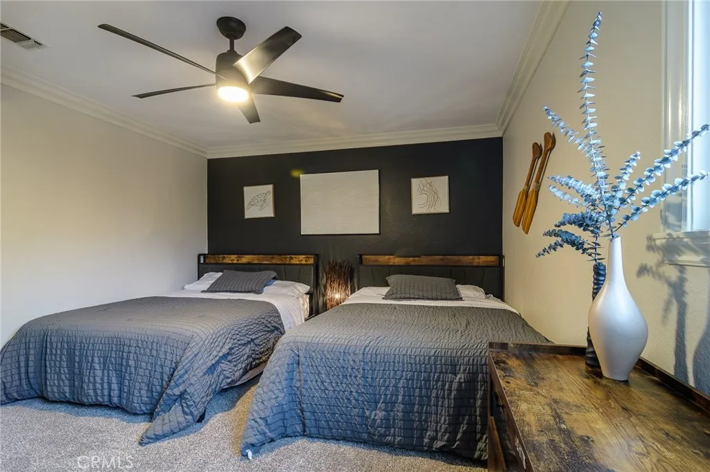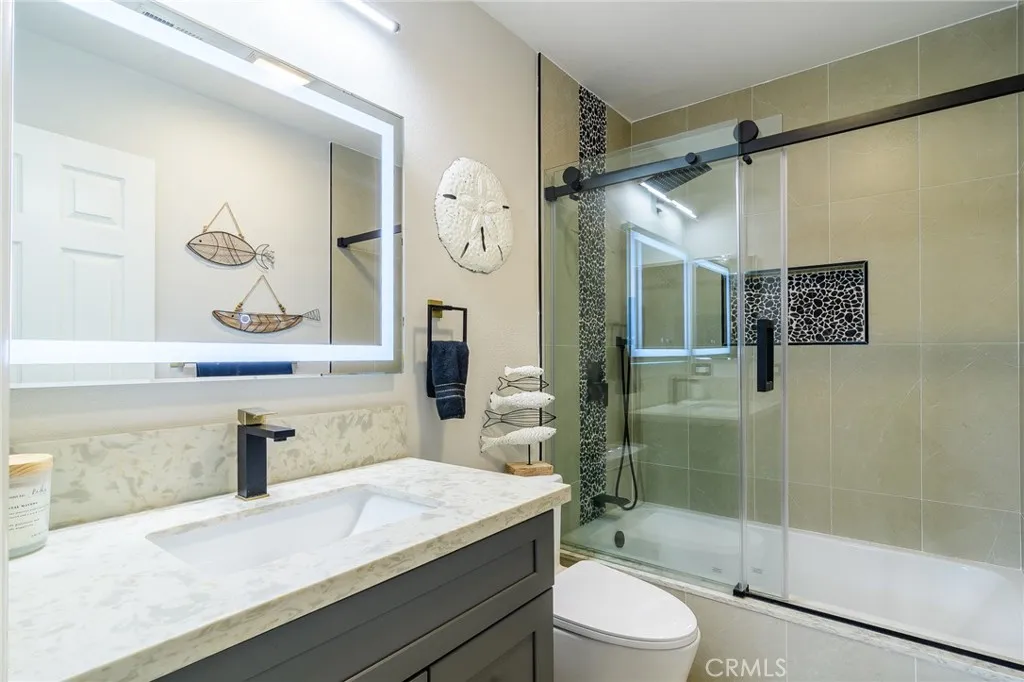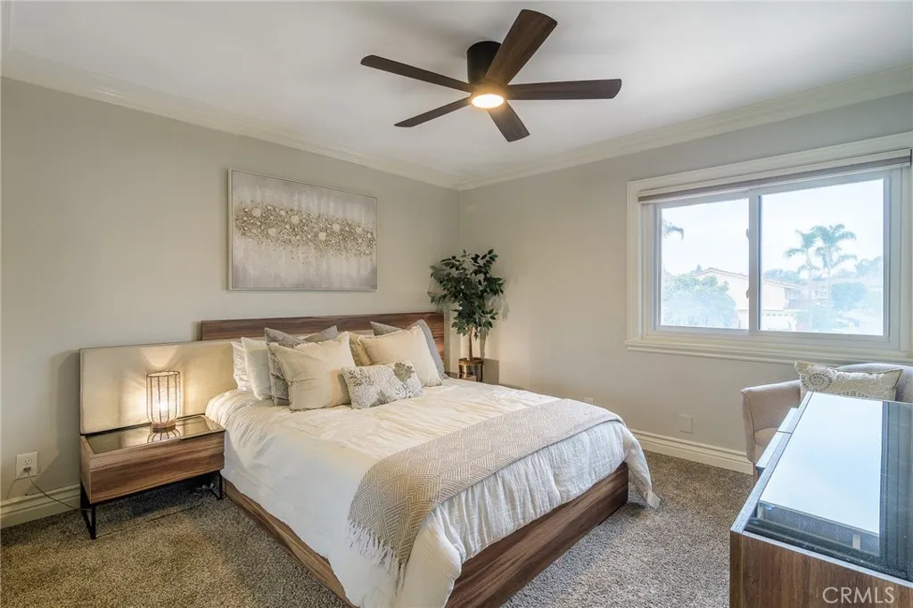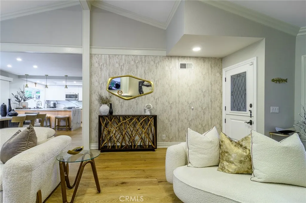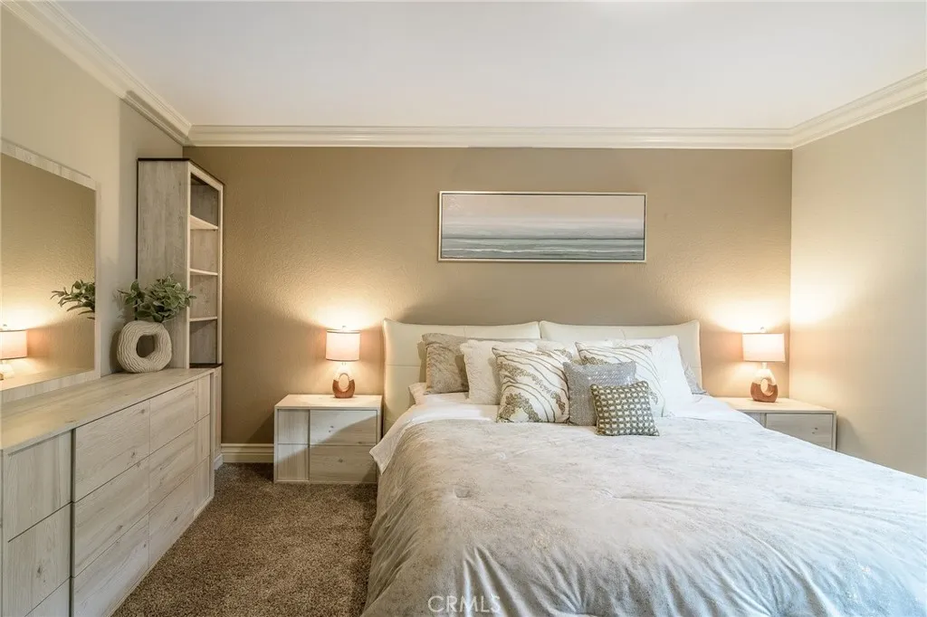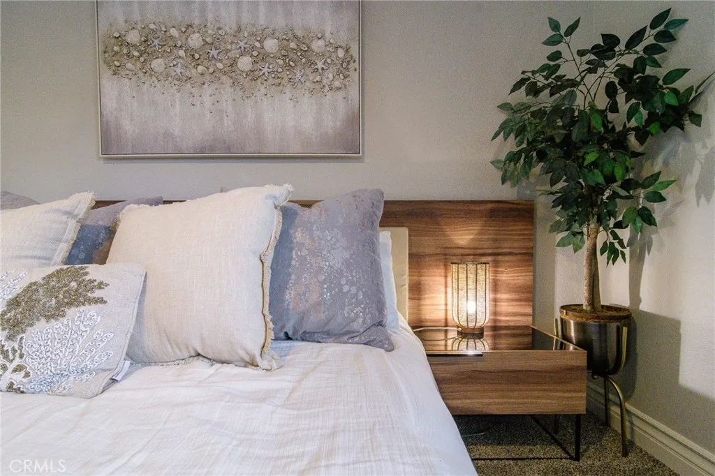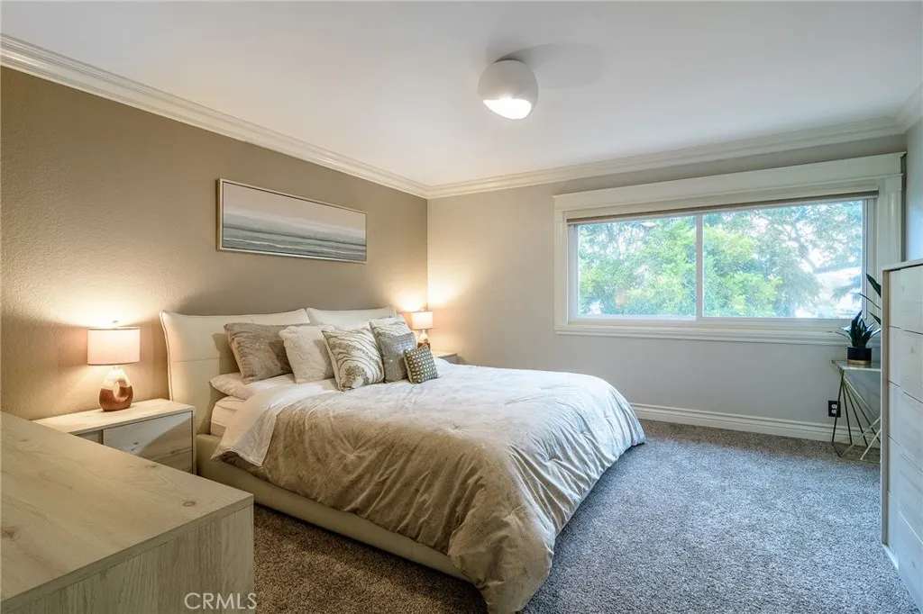 Experience coastal living at its finest in this beautifully fully remodeled, custom-designed townhome just steps from the beach, Pacific City, downtown Huntington Beach, parks, shopping, and dining. Located within the highly sought-after gated community of Seaside Village, residents enjoy access to a community pool/spa, tennis and sport courts, community event hall, and serene waterways. This two-story, 3-bedroom, 2.5-bath home is positioned at the end of a quiet cul-de-sac and features both a two-car driveway and an attached two-car garage with epoxy floor finish, extensive built-in storage & app operated smart liftmaster door opener. Welcomed through the custom Dutch door, enter into a spacious open plan living room that showcases a granite fireplace and dual oversized sliding glass doors that open onto an expansive, low-maintenance, East facing patio with stunning sunrise, waterway views & pedestal BBQ grill perfect for relaxing or entertaining. The home has been thoughtfully renovated with sophisticated contemporary finishes, Nordic modern lighting, custom millwork and crown molding throughout. The sleek open white kitchen includes quartz countertops, European frameless cabinetry, high-end white/gold Caf appliances, Chef sink with all gadgets and matching brass hardware. Hardwood flooring spans the main level, complemented by abundant natural light and motorized roller shades for effortless light control. The generous primary suite features an en-suite bath, with two additional well-sized bedrooms upstairs. All bathrooms have been upgraded with marble tile flooring, qua
