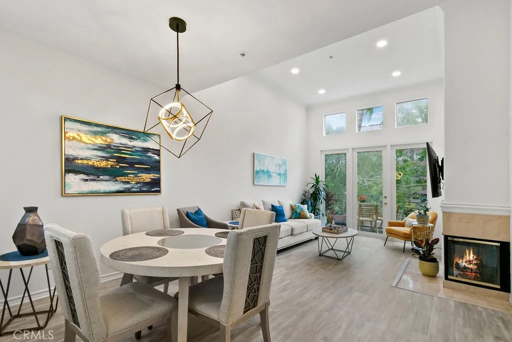 Refined penthouse living awaits in the guard-gated Metropolitan community in the heart of Irvine. This top-floor, fully furnished residence offers a sophisticated retreat with elevated finishes, serene surroundings, and effortless convenience, ideal for those seeking comfort, privacy, and style. The home is thoughtfully positioned near the community entrance with two side-by-side parking spaces and easy elevator access. Inside, dramatic 13-foot ceilings and expansive natural light highlight the open-concept design. The elegantly furnished living and dining areas are complemented by a cozy fireplace, while a custom-built den provides a flexible space for a home office, library, or guest accommodations. Curated upgrades include recessed lighting, quartz countertops, updated flooring, additional decorative cabinetry for enhanced storage, and a built-in drinking water filtration system. The primary suite is generously sized, featuring a walk-in closet, a well-appointed en-suite bath, and direct access to a private balcony. Surrounded by mature treetops, the balcony offers a tranquil setting for morning coffee or evening relaxation. Residents enjoy resort-inspired amenities including 24-hour guard-gated security, lush landscaped grounds, a lap pool and heated spa, a fully equipped fitness center, and an elegant clubhouse. Water and trash included, adding to the ease of luxury furnished living. Offered fully furnished, this penthouse presents an exceptional opportunity for refined living in one of Irvines most desirable communities. $150 community transfer fee and $25 transponder