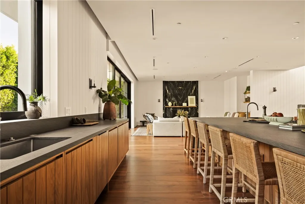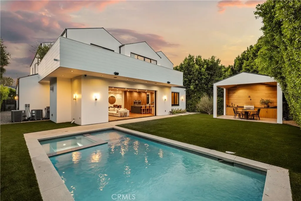 This awe-inspiring newer construction estate by JVE Development featuring refined design details by Jae Omar. Sits quietly on a cul-de-sac in the heart of Encino. A rare combination of striking architecture, thoughtful finishes, and a floor plan designed for both grand entertaining and everyday comfort, this home is the definition of modern luxury. Step inside to soaring ceilings and a seamless open layout accented with rich wood details. The living room centers around a sleek fireplace and opens through oversized disappearing pocket doors to the backyard, blurring the line between indoor and outdoor living. The custom chefs kitchen is a true showpiece, complete with professional-grade appliances, an oversized waterfall island with seating, and a pass-through window for effortless outdoor dining. A butlers pantry connects the kitchen to the elegant formal dining room, perfect for hosting dinner parties. Upstairs, four spacious ensuite bedrooms provide comfort and privacy. The primary suite is a true retreat, with a private balcony, wet bar, custom walk-in closet, and a spa-like bath featuring dual vanities, a soaking tub, and a glass-enclosed shower. Designed with entertaining in mind, the backyard is a private oasis: a sparkling pool and spa, cabana with kitchenette, and a lush grassy area create the perfect setting for gatherings. Additional highlights include a state-of-the-art home theater with a bonus lounge area, a main-level ensuite bedroom, smart home features, and a two-car garage. All of this in an unbeatable location, Lanai and Hesby Oaks school districts, just m